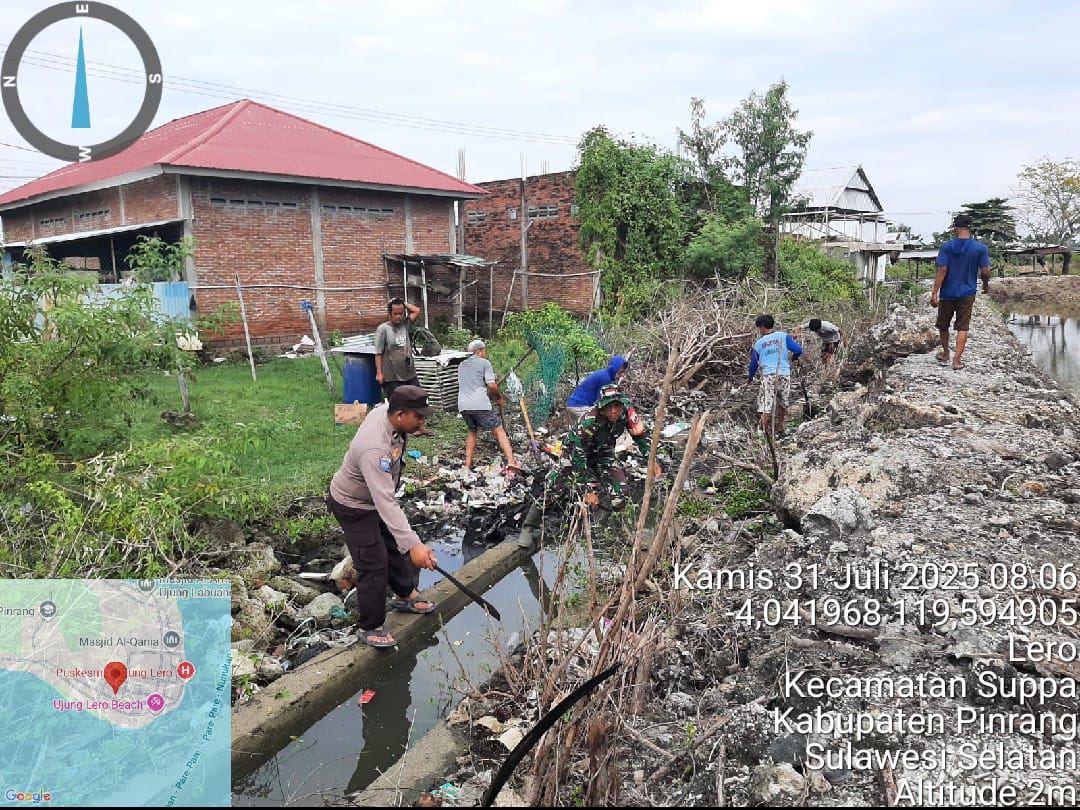 Pinrang_ Untk menjaga kebersihan Lingkungan, Koramil-01/Suppa Kodim 1404/Pinrang menggelar kerja bakti bersama Staf Kelurahan, Bhabinkamtibmas dan warga dengan sasaran pembersihan saluran air di Dusun Butung Desa Lero Kecamatan Suppa Kabupaten Pinrang, Jum’at (01/08/2025).