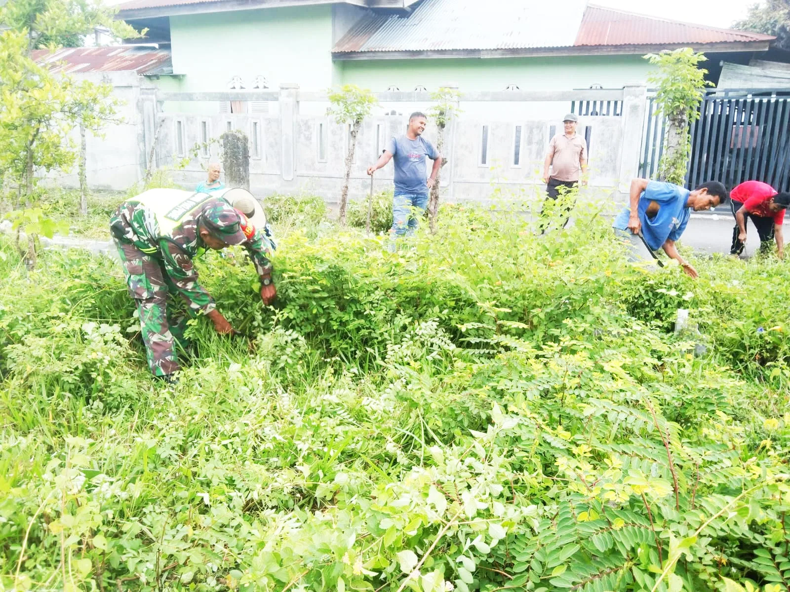 Dengan menggunakan peralatan sederhana, Babinsa dan masyarakat bekerja bersama membersihkan rumput liar, ranting, serta sampah yang menumpuk di area tersebut.