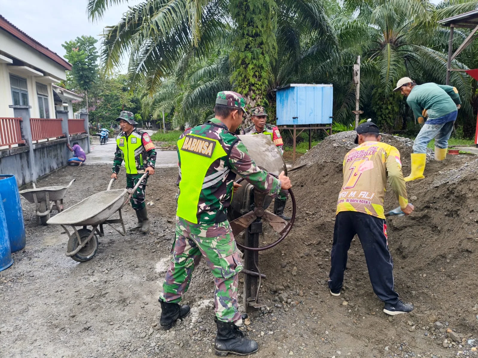 Nagan Raya – Bintara Pembina Desa (Babinsa) Posramil Kuala Pesisir Kodim 0116/Nara Koptu Hendra Saputra, babinsa lainnya bersama warga melaksanakan gotong- royong pengecoran lorong jalan di Desa Kuala Trang Kecamatan Kuala Pesisir Kabupaten Nagan Raya Rabu,(05/11/2025).