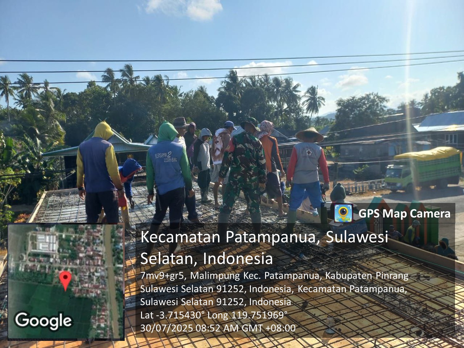 Pinrang_ Wujud kepedulian TNI terhadap pembangunan sarana ibadah masyarakat ditunjukkan oleh Babinsa Koramil-05/Patampanua Kodim 1404/Pinrang Sertu Deni Agus Subroto yang melaksanakan kegiatan gotong-royong bersama warga dalam pengecoran lantai atas Masjid Nurul Amrullah di Desa Malimpung Kecamatan Patampanua Kabupaten Pinrang, Rabu (30/07/2025).