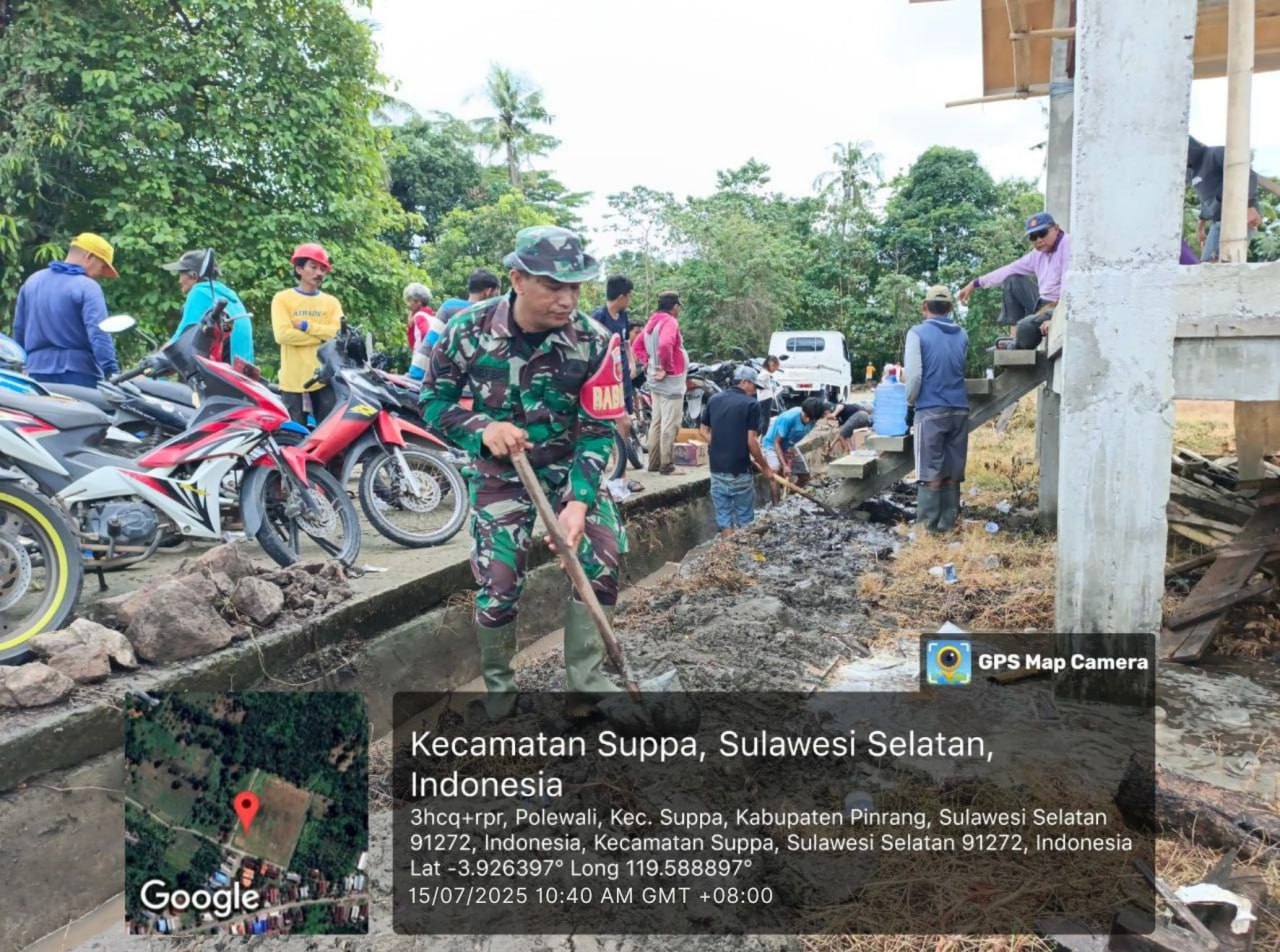 Pinrang_ Dukung Ketahanan pangan, Babinsa Koramil-01/Suppa Kodim 1404/Pinrang Sertu Arief Budi berbaur bersama Staf Desa dan warga melaksanakan kerja bakti pembersihan saluran irigasi di Dusun Belabelawa Desa Polewali Kecamatan Suppa Kabupaten Pinrang, Rabu (16/07/2025).
