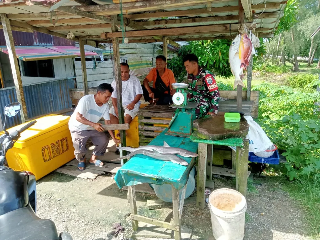 Simeulue – Sertu Supriyatna Babinsa Posramil teupah Barat, Kodim 0115/Sml, Korem 012/Tu, melaksanakan komsos dengan penjual ikan di Awe Kecil, Kecamatan Teupah Barat, Kabupaten Simeulue. Minggu (12/04/2026).