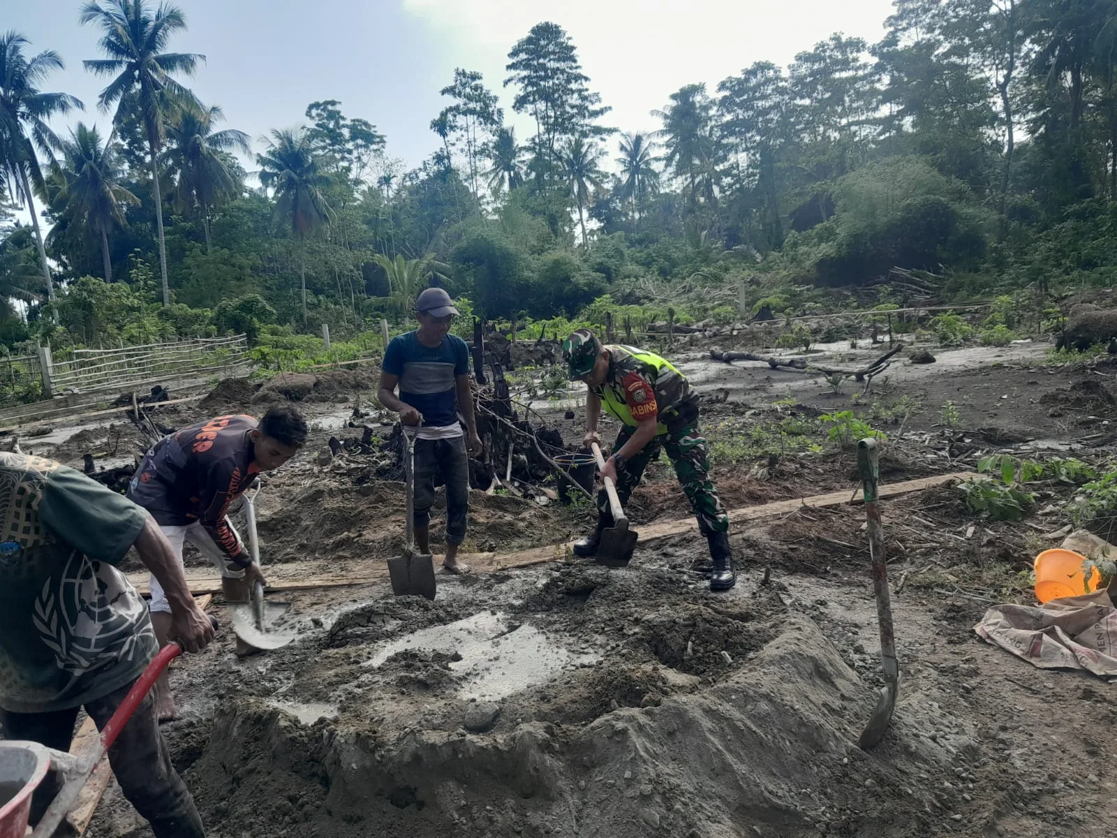 Kegiatan tersebut diikuti langsung oleh Serda Azhari yang turun bersama warga mengerjakan pemasangan pagar secara manual.