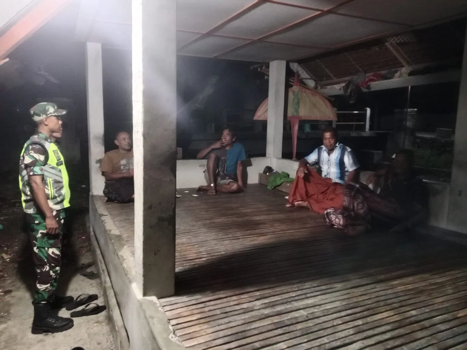 Warga Desa Mesjid Reubee menyambut baik kehadiran Babinsa yang turun langsung ke pos ronda. Suasana akrab terlihat saat warga berbincang santai sambil berjaga, menunjukkan kedekatan antara aparat dan masyarakat.
