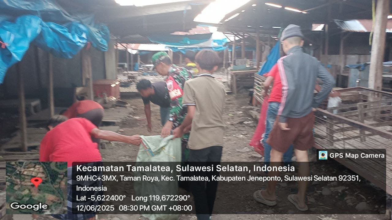 Jeneponto – Personel Babinsa Koramil 03/Tamalatea Kodim 1425/Jeneponto bersama warga bergotong royong membersihkan pasar Tradisional Tamanroya, Kelurahan Tamanroya, Kecamatan Tamalatea, Kabupaten Jeneponto, demi menciptakan lingkungan yang bersih, sehat, dan nyaman. Kamis, 12/6/2025.