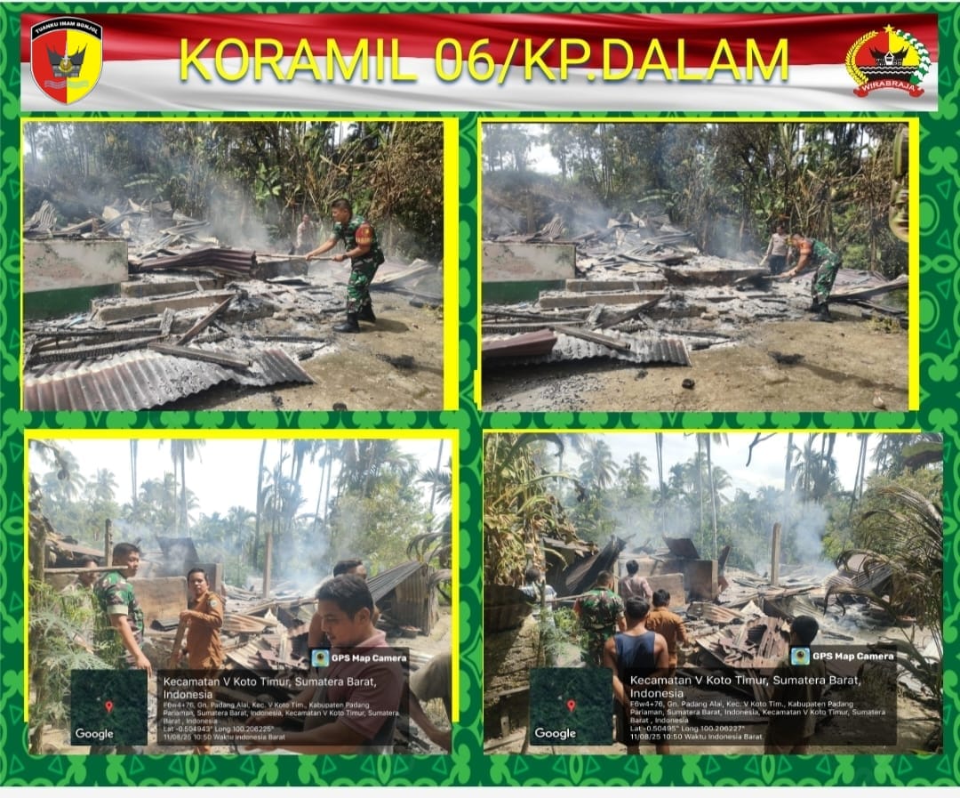 KAMPUNG DALAM, – Telah terjadi kebakaran satu unit rumah warga atas Nama Rama, Usia 65 thn, Suku Piliang, Pekerjaan IRT, Alamat Korong kampung tanjung Nagari Gunung Padang Alai kec V Koto Timur kab Padang Pariaman, Kejadian pukul 07:30 wib pemilik rumah sedang ke warung untuk membeli keperluan rumah tangga.