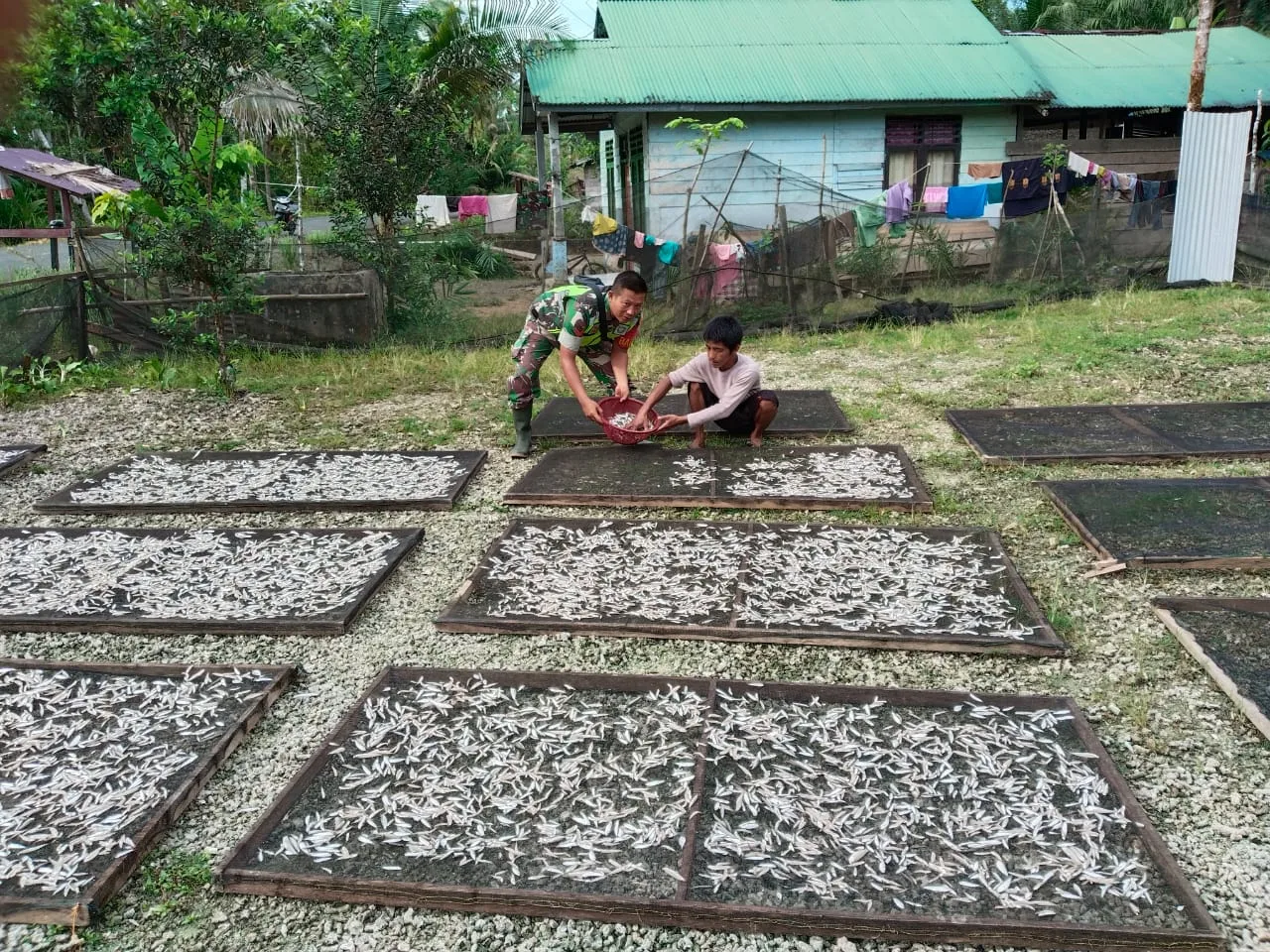Simeulue – Koptu Apriandi Babinsa Koramil 06/Teluk Dalam, Kodim 0115/Simeulue, Korem 012/Teuku Umar. Laksanakan kegiatan membantu warga jemur ikan kering di Desa Bulu Hadek, Kabupaten Simeulue. Minggu (05/10/2025).