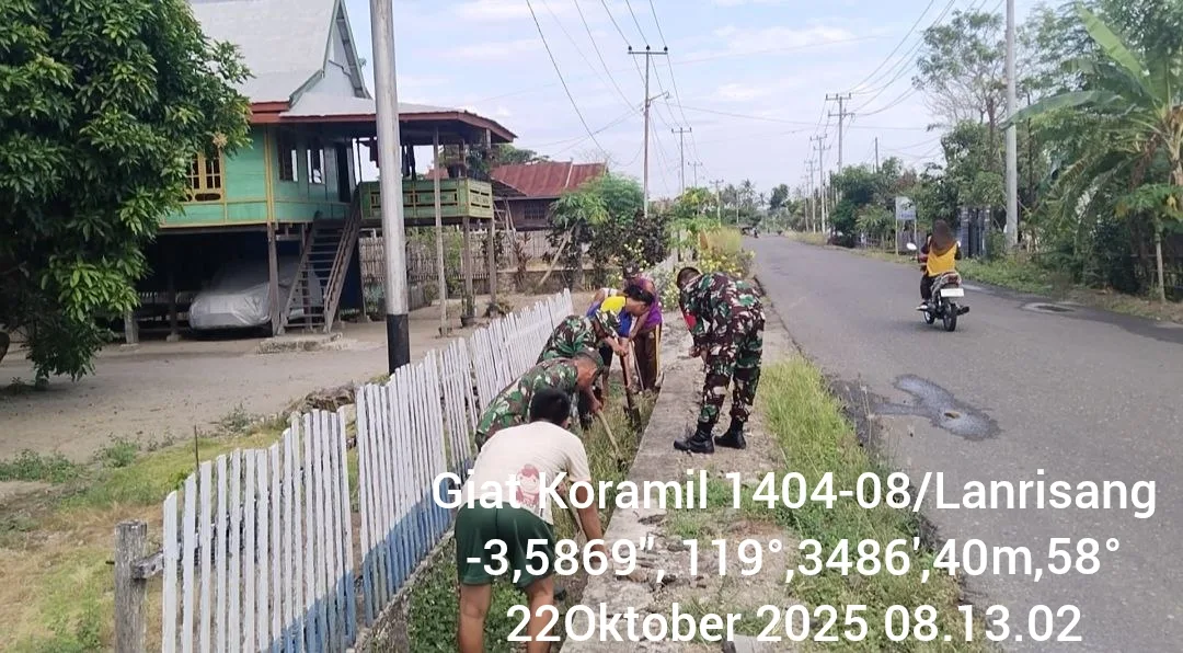 Pinrang_ Babinsa Koramil-08/Lanrisang Kodim 1404/Pinrang melaksanakan kegiatan kerja bakti pembersihan saluran air bersama warga di Dusun Padang Lampe, Desa Samaulue, Kecamatan Lanrisang, Kabupaten Pinrang, Rabu (22/10/2025).