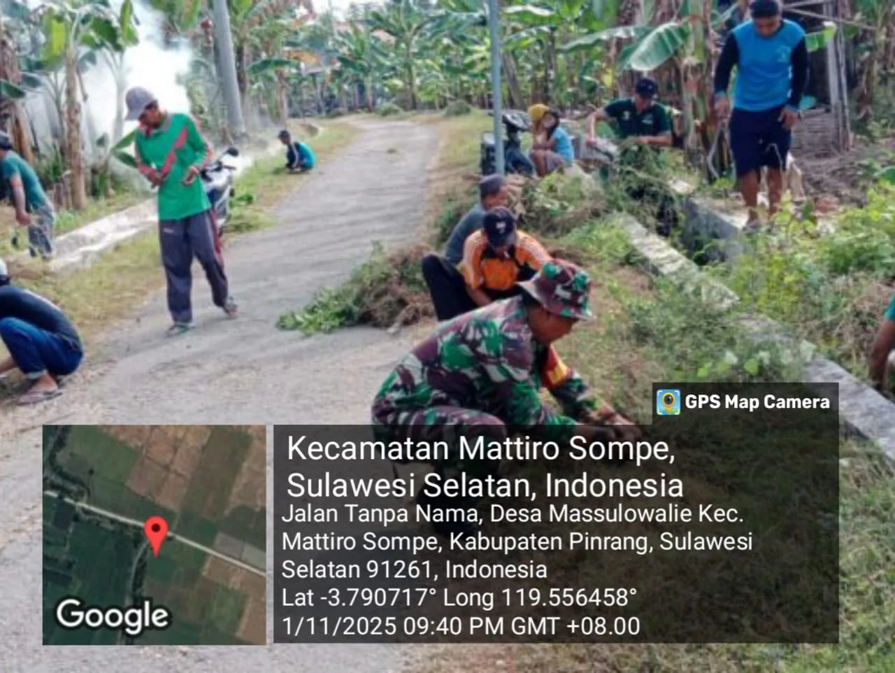 Pinrang_ Dalam upaya menjaga kebersihan lingkungan dan mempererat kemanunggalan TNI dengan rakyat, Babinsa jajaran Koramil 1404-02/Mattiro Sompe Kodim 1404/Pinrang melaksanakan kegiatan Karya Bakti bersama masyarakat di Dusun Sekkang, Desa Massulowalie, Kecamatan Mattiro Sompe, Kabupaten Pinrang, Selasa (04/11/2025).