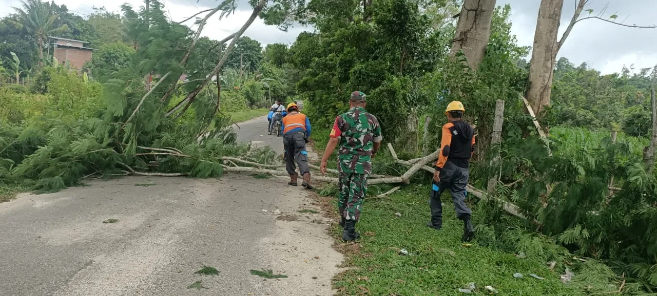 Mengetahui kondisi tersebut, Babinsa dengan sigap mengambil tindakan cepat bersama warga sekitar untuk memindahkan pohon tumbang dari badan jalan. Dengan peralatan seadanya dan semangat gotong royong, pohon berhasil dipindahkan sehingga akses jalan kembali normal dan aman dilalui oleh kendaraan maupun pejalan kaki.