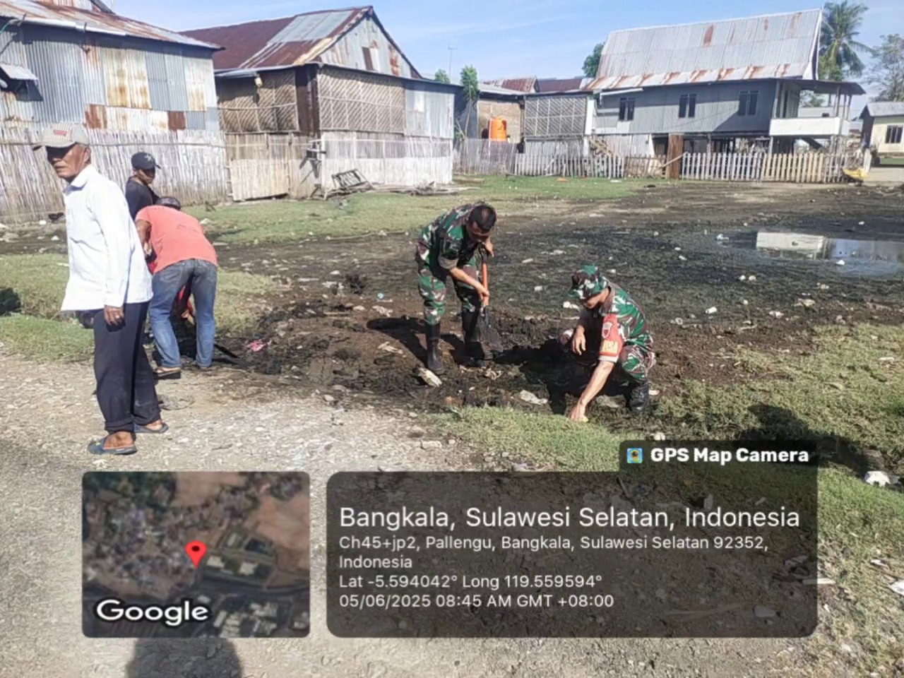Jeneponto – Babinsa Koramil 02/Bangkala Kodim 1425/Jeneponto, bersama warga melaksanakan kegiatan gotong royong membersihkan saluran air di lingkungan permukiman.