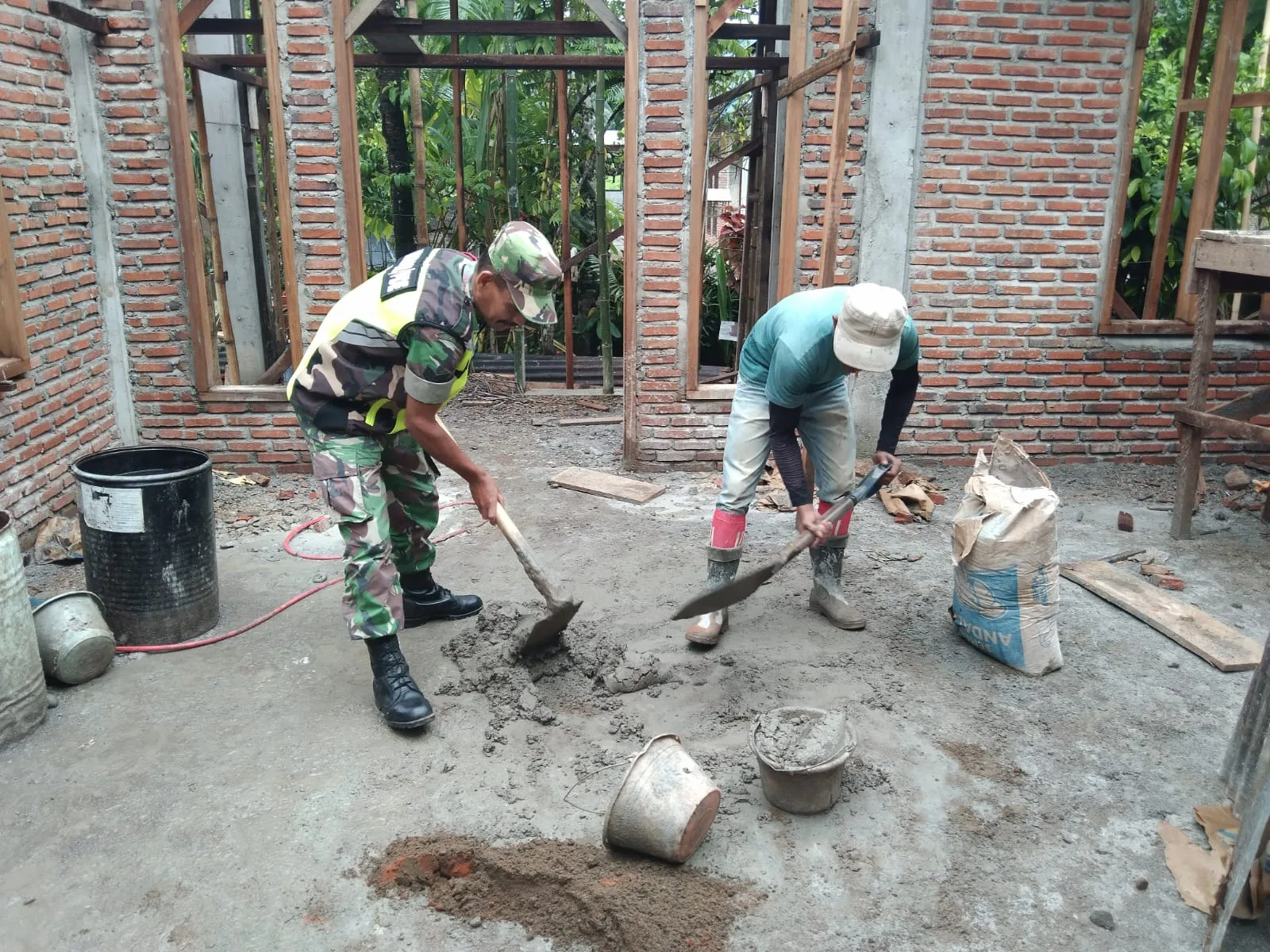 Dengan penuh semangat kebersamaan, Serka Abu Bakar ikut mengaduk material semen bersama warga. Kegiatan tersebut bertujuan untuk meringankan beban kerja masyarakat sekaligus mempercepat proses pembangunan rumah milik Samsuar yang dilakukan secara swadaya.