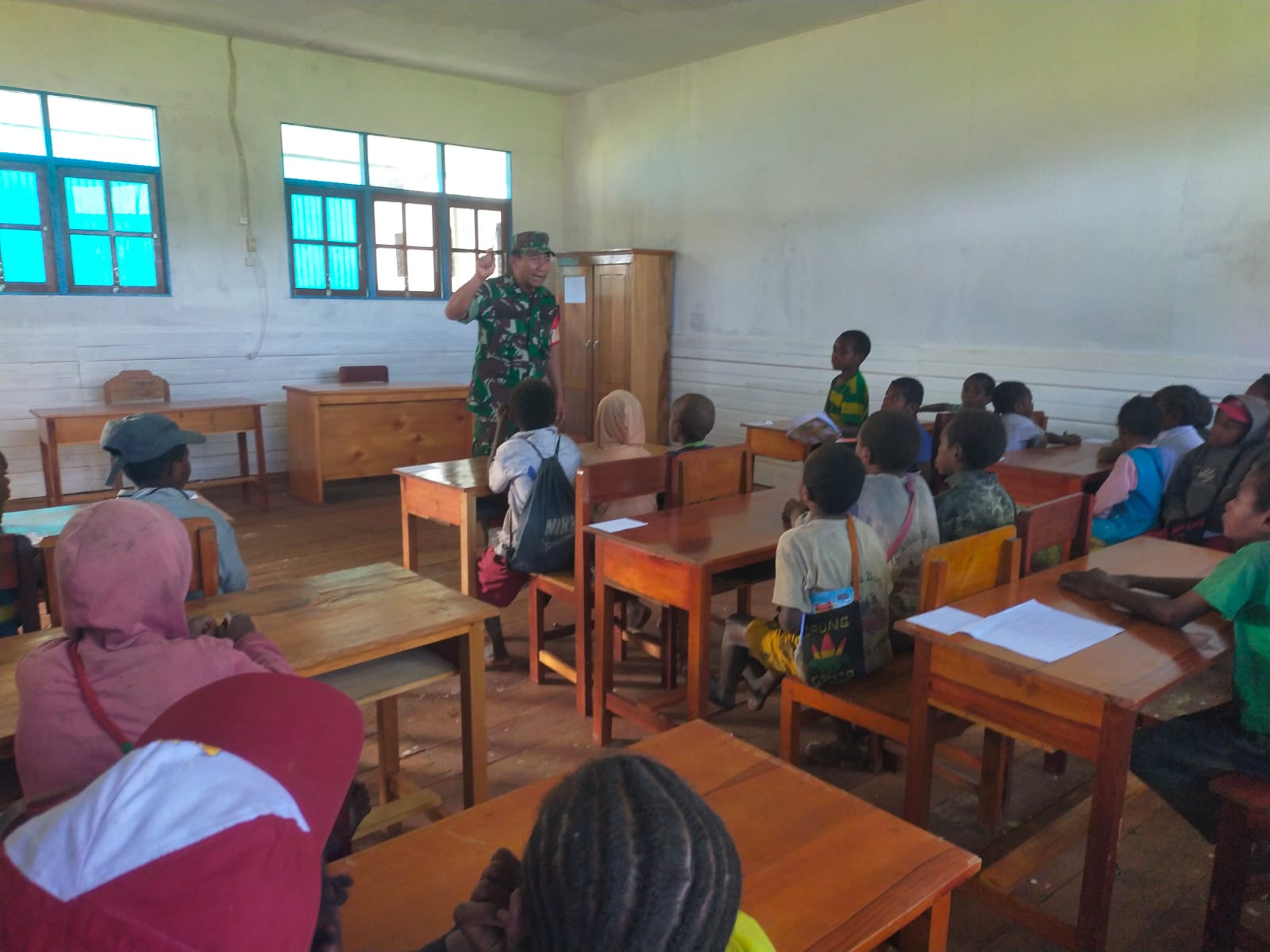 Obano – Untuk menumbuhkan jiwa patriotisme terhadap generasi muda penerus bangsa, Bintara Pembina Desa (Babinsa) Koramil 1703-03/Obano Serda Boy Manik, memberikan Wawasan Kebangsaan (Wasbang) kepada siswa-siswi SD Inpres Obano. Kampung Obano, Distrik Paniai Barat, Kabupaten Paniai, Prov. Papua Tengah. Selasa,(22/07/2025).