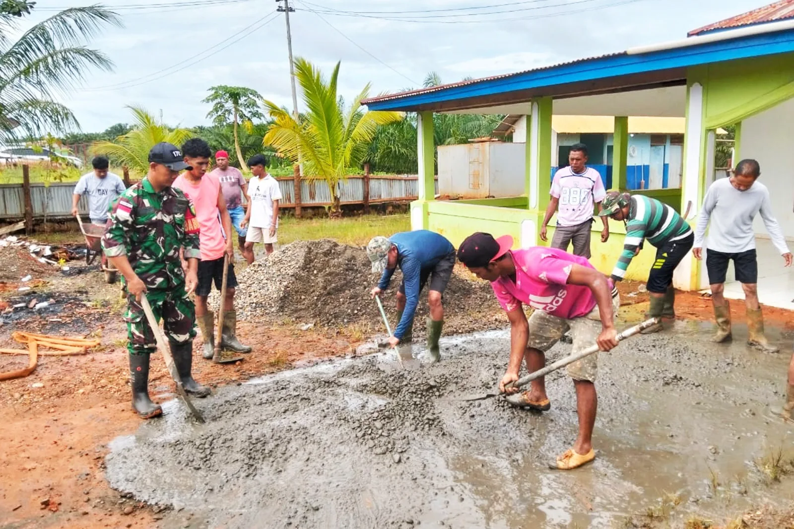 Kegiatan yang dimulai pukul 08.00 WIT tersebut berlangsung penuh keakraban. Babinsa dan warga bahu-membahu mengangkat material, mengaduk semen, serta mengecor pondasi pagar masjid sebagai bagian dari pembangunan sarana ibadah yang menjadi pusat kegiatan keagamaan masyarakat Kampung Selil.