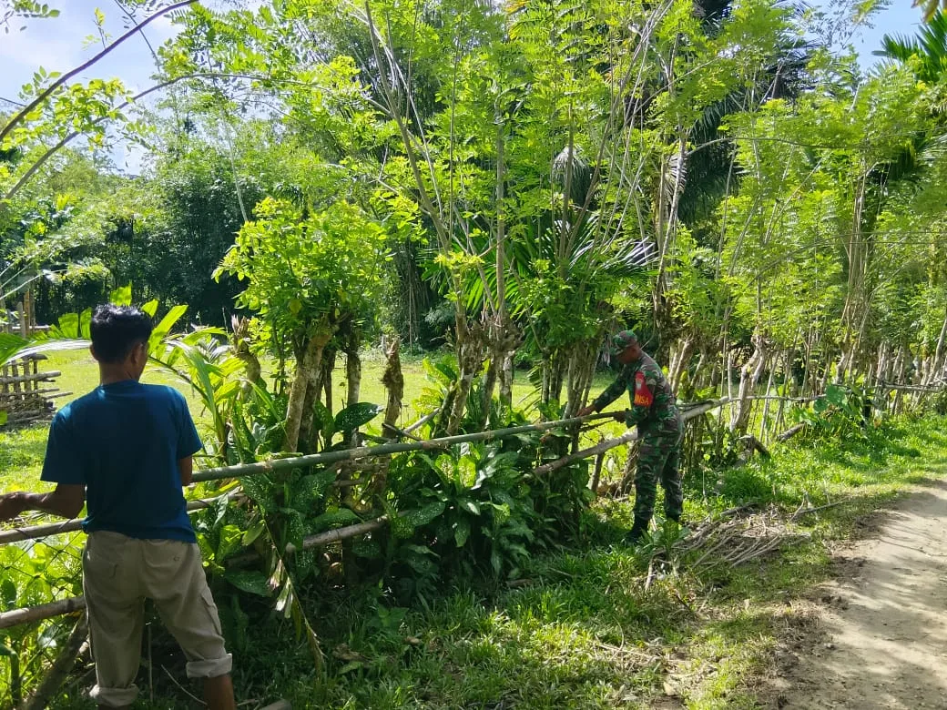 Simeulue – Posramil Teupah Barat, Kodim 0115/Simeulue, Korem 012/Teuku Umar. Babinsa Koptu Ahmad Rison dan Bhabinkamtibmas (Bhayangkara Pembina Keamanan Ketertiban Masyarakat) melakukan pengecekan pagar sawah sebagai bagian dari tugas pembinaan Di Desa Salur Latin, Kecamatan Teupah Barat, Kabupaten Simeulue. Minggu (04/01/2026).