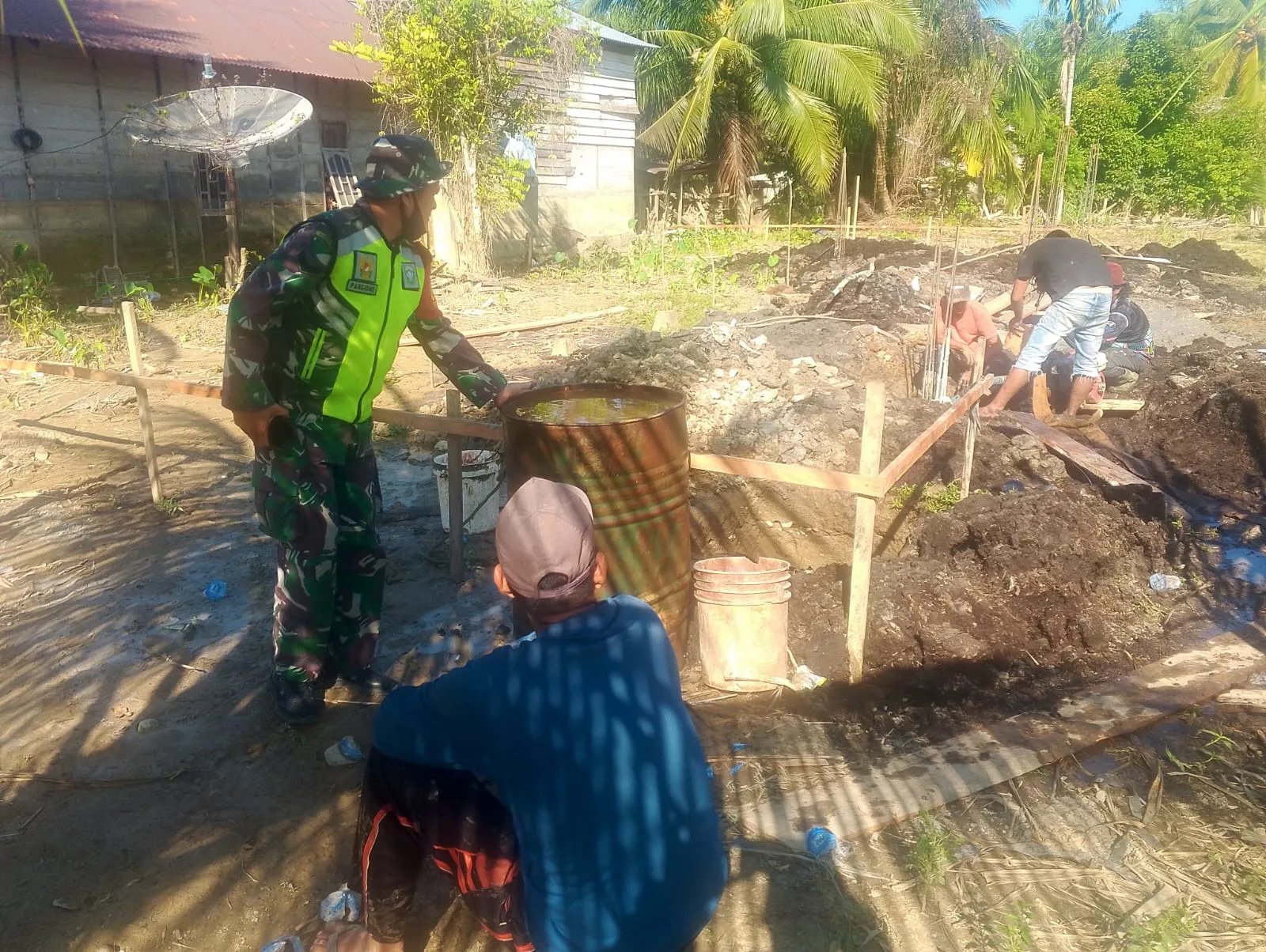 Nagan Raya – Babinsa Posramil Tripa Makmur Kodim 0116/Nagan Raya Sertu Pargiono melaksanakan kegiatan Komunikasi Sosial (Komsos) dengan masyarakat para pekerja yang sedang bekerja membangun rumah salah satu warga Desa Drien Tujoh, Kecamatan Tripa Makmur Kabupaten Nagan Raya, Selasa (03/02/2026).