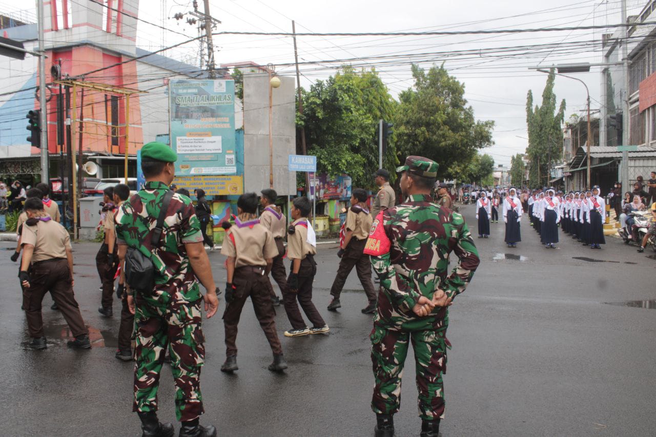 Pinrang_ Berikan motivasi dan semangat, Kasdim 1404/Pinrang Mayor Inf Oberan, T.B, mewakili Dandim melepas peserta lomba gerak jalan tingkat pelajar SMP sederajat dan SMA/SMK putra dan putri dalam rangka memperingati HUT Kemerdekaan RI ke-80 tahun 2025, Senin (11/08/2025).