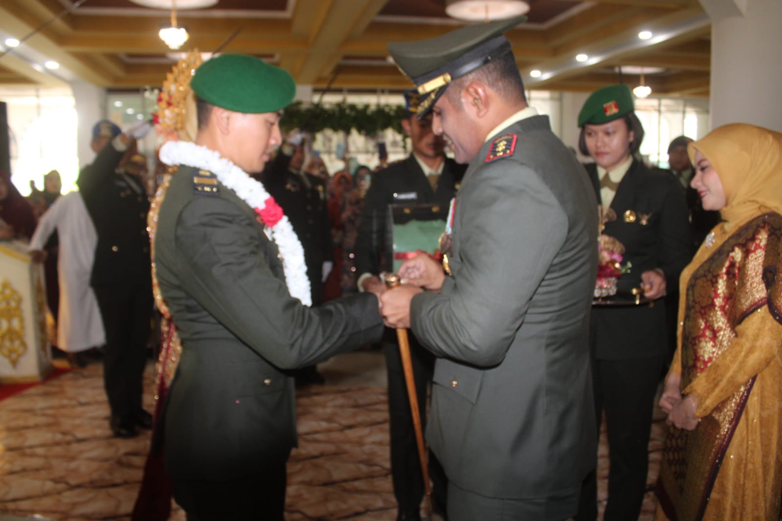 Dandim 1404/Pinrang Letkol Abdullah Mahua dan Ketua Persit Cabang XXXIX Kodim 1404/Pinrang Ny. Dera Abdullah Mahua memberikan ucapan selamat kepada Lettu Cba Muh. Jamil Ruslan, S. Tr ( Han) dengan Letda Caj (K) Janatun Magwa, S. Tr (Han) yang telak melangsungkan pernikahan.