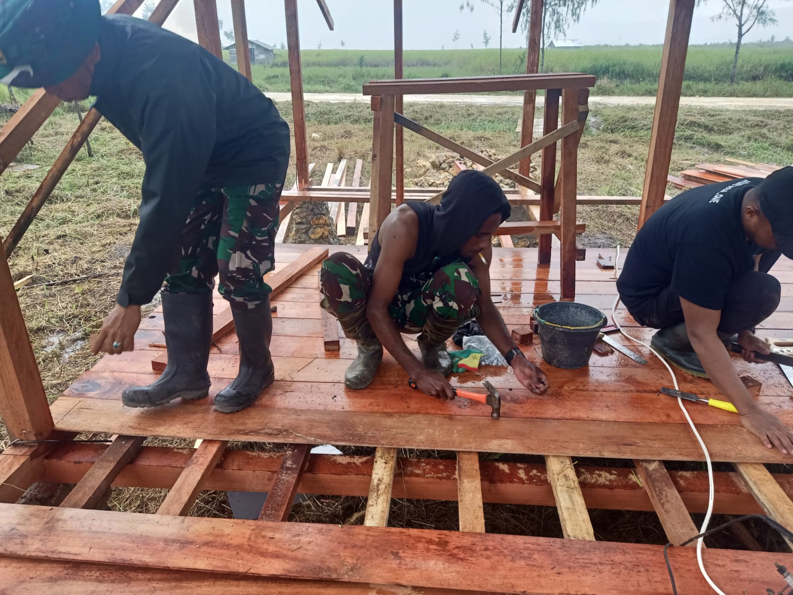 Bibida – Salah satu sasaran fisik program Koramil 1703-01/Enarotali, Kodim 1703/Deiyai, berupa Karya Bhakti perehapan Rumah Tidak Layak Huni (RTLH) milik Bapak Kris Zonggonau (Kepala suku kampung Bibida), warga Kampung Bibida, Distrik Bibida, Kabupaten Paniai, kini telah sampai pada proses pemasangan kerangka atap di Lanjutkan pemasangan atap dari bahan Seng dan Pasang papan secara berurutan di atas rangka lantai. Kamis (07/08/2025).