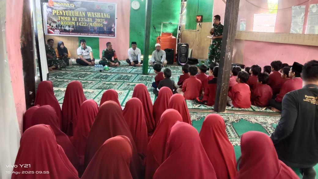Maros – Komandan Kodim 1422/Maros Letkol Arm Agung Yuhono, S. E, selaku Dansatgas TMMD ke -125 memberikan Penyuluhan Wawasan Kebangsaan kepada adik-adik generasi muda khususnya para Siswa/siswi pondok pesantren, kegiatan ini sangatlah perlu adik-adik tau dan diingatkan serta ditanamkan kembali tentang wawasan kebangsaan sejak dini. Kegiatan di laksanakan di Pondok Pesantren Ukhuw,wah Islamiyyah MK-Uba Mapin Kelurahan Sabila Kecamatan Mallawa, Jum’at (15/8/2025).