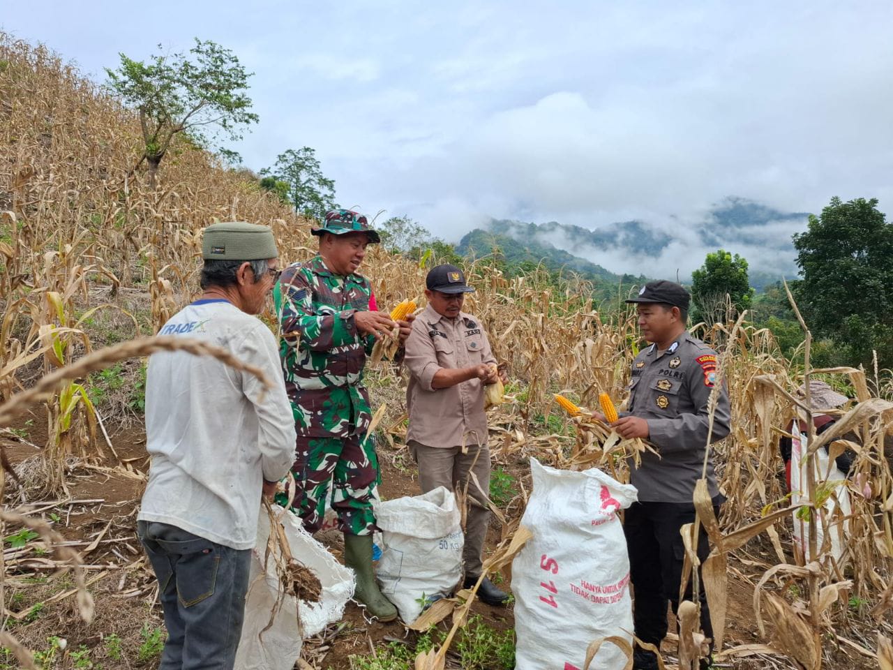 Pinrang_ Untuk mendukung ketahanan pangan dan meningkatkan kesejahteraan petani, 3 pilar Desa Batulappa yaitu Babinsa Koramil-05/Patampanua Kodim 1404/Pinrang Serma Muhammad Hatta, Bhabinkamtibmas Polsek Patampanua Brigpol Andy dan Kepala Desa Batulappa Abdul Taha membantu warga panen jagung, Senin (01/09/2025).