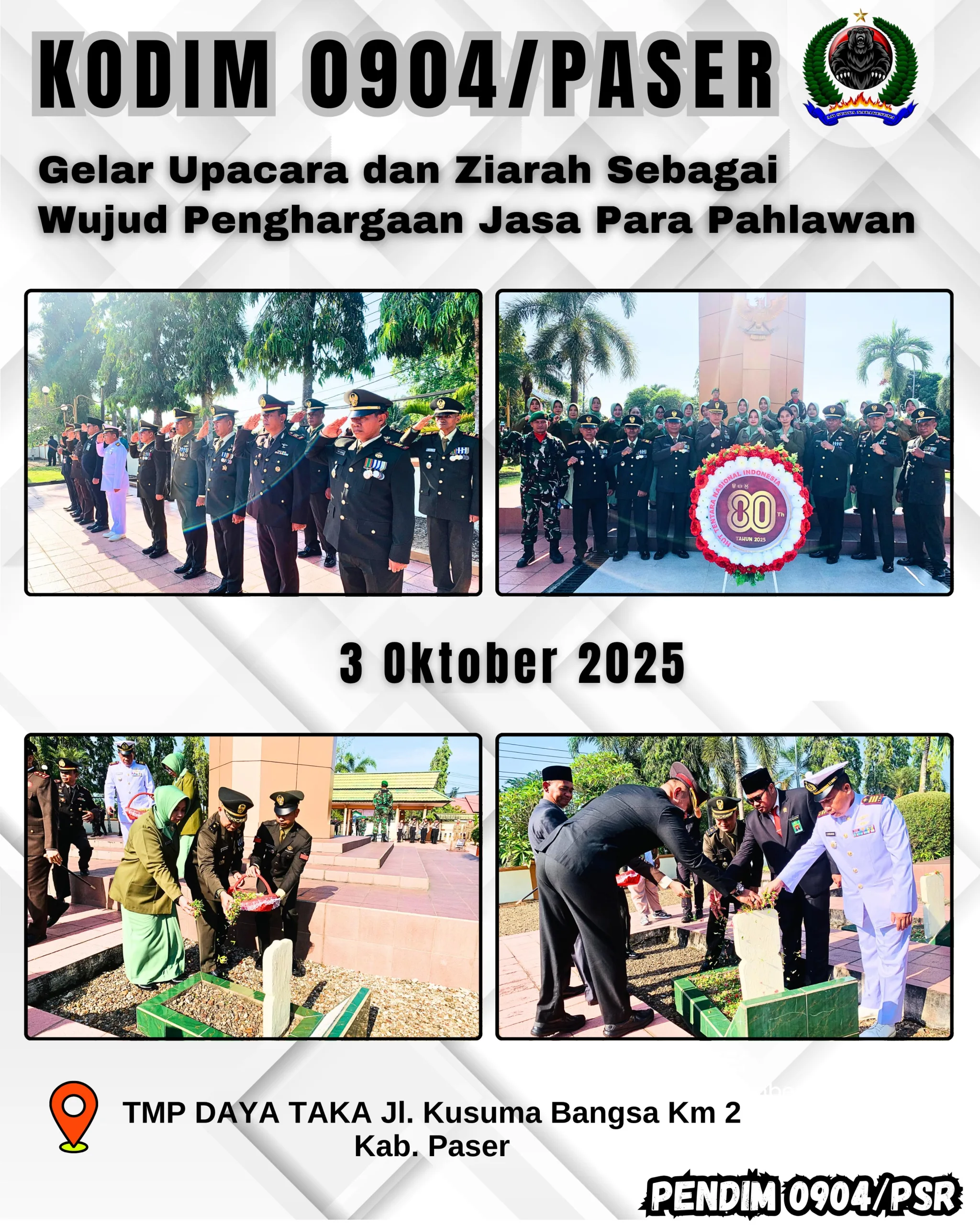 Kodim 0904/Psr, Korem 091/ASN, Kodam VI/Mlw – Pada hari Jumat tanggal 03 Oktober 2025 pukul 08.10 WITA telah dilaksanakan Upacara dan Ziarah dalam rangka Memperingati HUT TNI ke-80 tahun 2025 yang bertempat di Taman Makam Pahlawan Daya Taka Km. 01, Jalan Kesuma Bangsa, Desa Tepian Batang, Kec. Tanah Grogot, Kab. Paser.