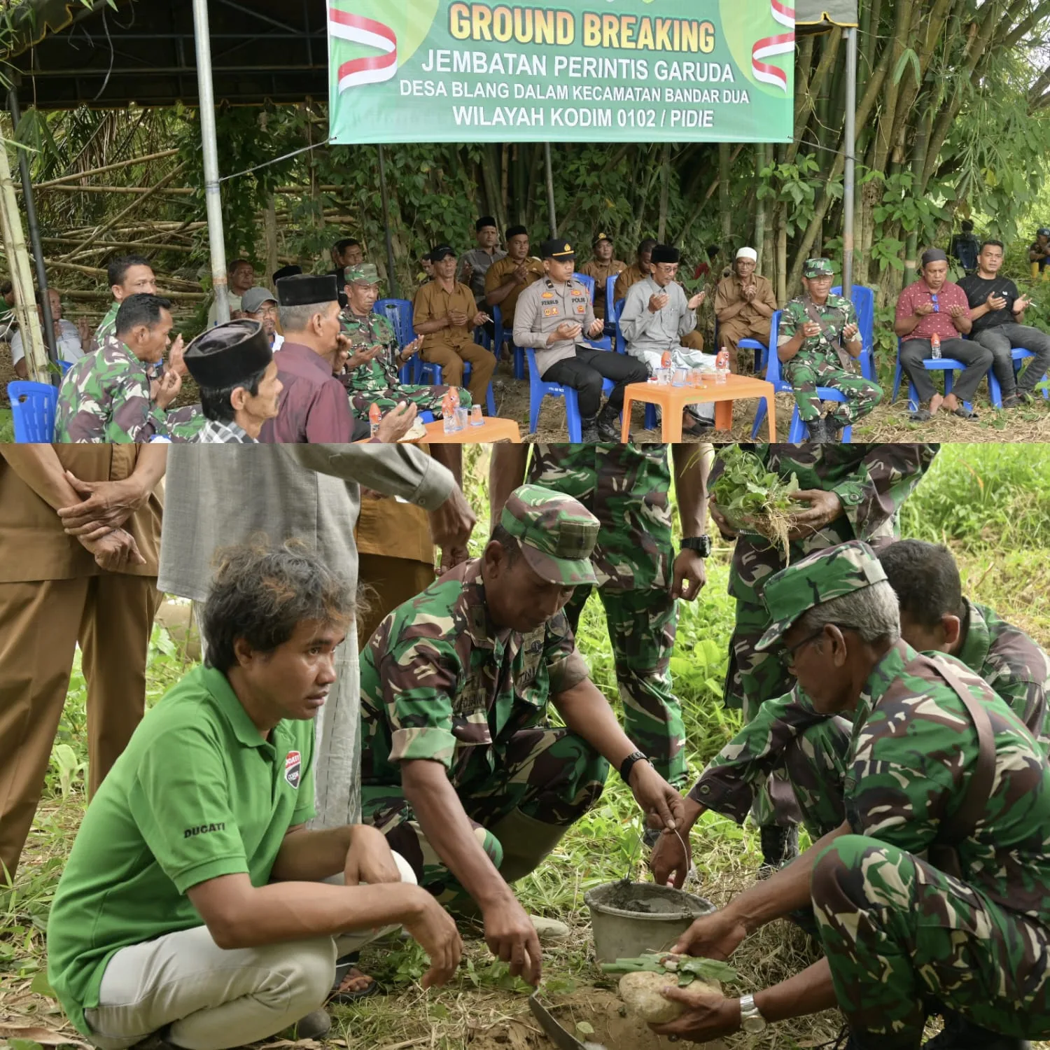 Kegiatan tersebut dipimpin oleh Perwira Penghubung Kodim 0102/Pidie, Mayor Inf Ruslan, yang mewakili Komandan Kodim 0102/Pidie. Prosesi diawali dengan tradisi adat peusijuek dan doa bersama, mencerminkan harapan masyarakat agar pembangunan berjalan lancar serta membawa manfaat jangka panjang.