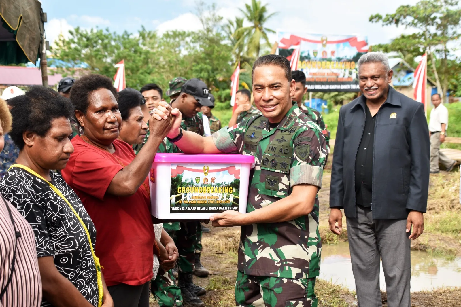 Nampak hadir para pejabat Kodam XXIV/Mandala Trikora, Danrem 174/ATW Brigjen TNI Mustakim, S.I.P., M.Si., Kasi Keterpaduan Pembangunan BWS Papu Selatan Quentino Elgar dan Kepala Kampung Chandra Jaya Bapak Aris.