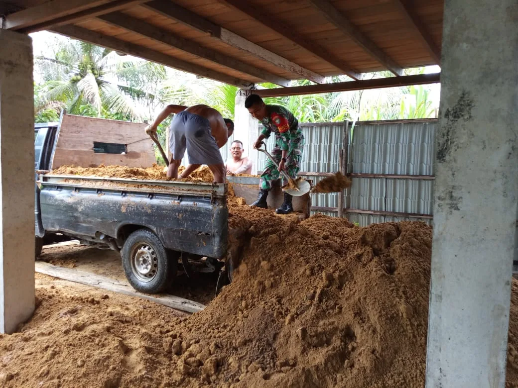 Babinsa Koramil 02/Simeulue Tengah, Kodim 0115/Simeulue, Korem 012/Teuku Umar, Koptu Alip melaksanakan kegiatan membantu warga desa yang sedang mengayak Pasir untuk digunakan merehap lantai rumah di Desa Putra Jaya, Kecamatan Simeulue Tengah, Kabupaten Simeulue. Sabtu (27/12/2025).