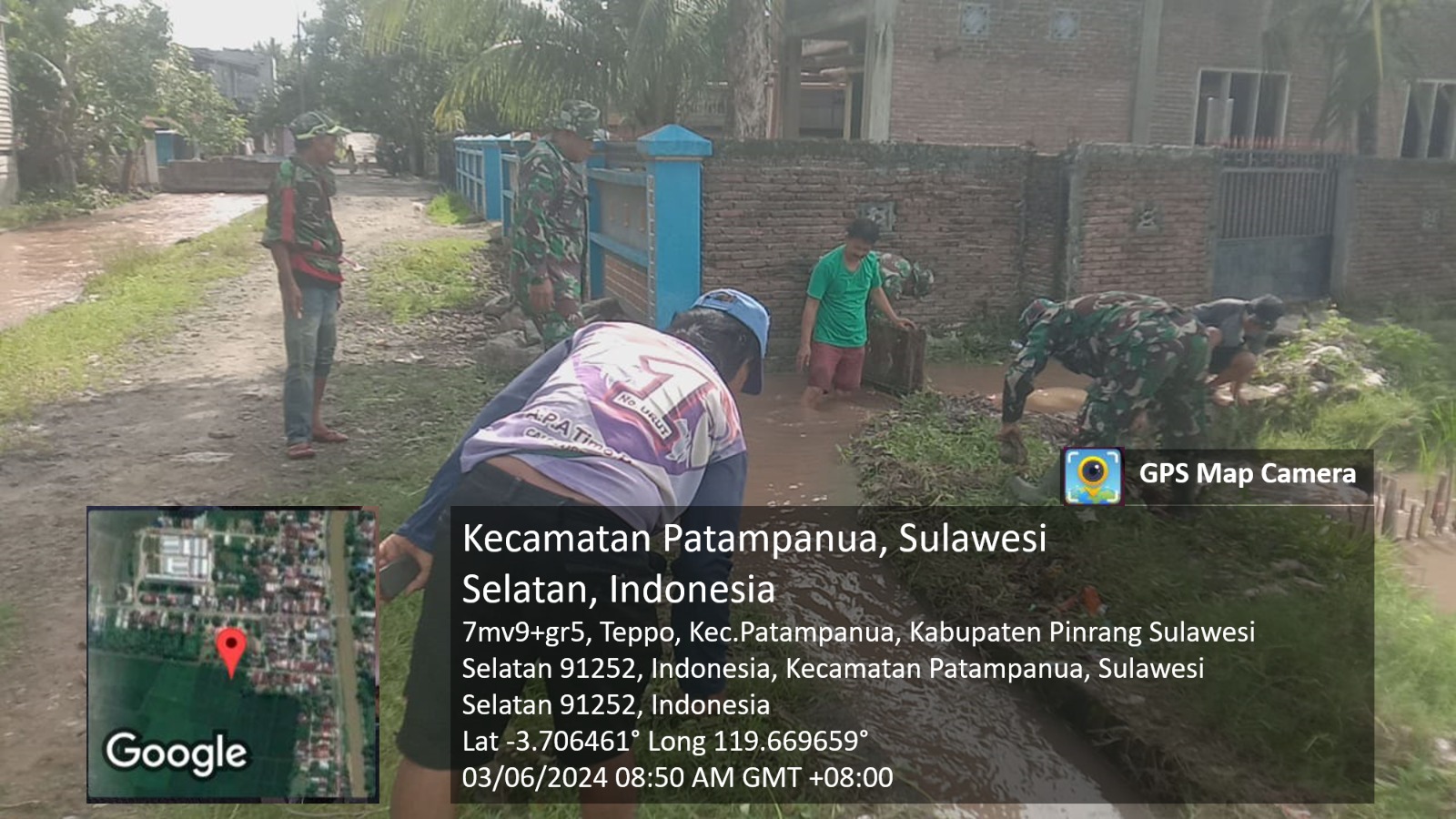 Pinrang_ Untuk memperlancar air mengairi persawahan petani, Babinsa jajaran Koramil-05/Patampanua Kodim 1404/Pinrang melaksanakan kerja bakti pembersihan saluran irigasi di Kelurahan Teppo Kecamatan Patampanua Kabupaten Pinrang, Selasa (03/06/2025).