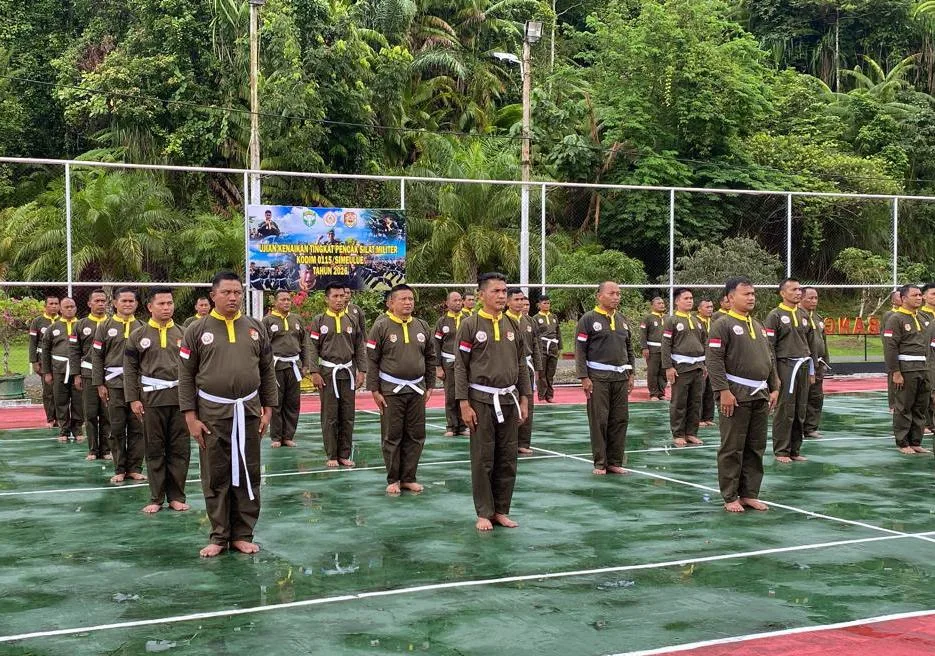 Simeulue – Personil Kodim 0115/Sml, Korem 012/Tu, melaksanakan ujian kenaikan tingkat Pencak Silat Militer (PSM) dari sabuk putih ke sabuk kuning di lapangan Tenis Kodim 0115/Simeulue, Desa Amaiteng, Kecamatan Simeulue Timur, Kabupaten Simeulue, Sabtu (18/04/2026).
