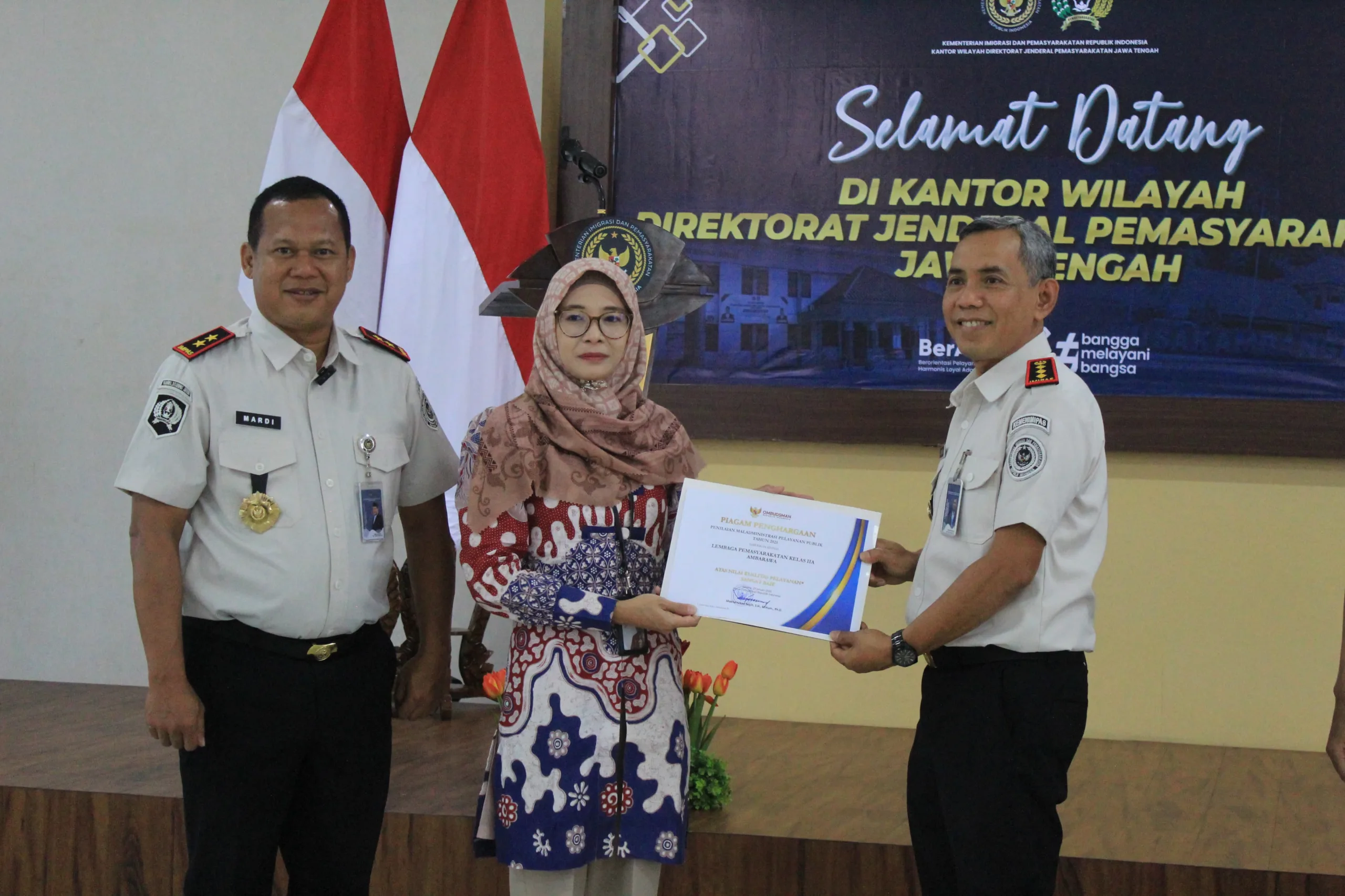 SEMARANG– Lembaga Pemasyarakatan (Lapas) Kelas IIA Ambarawa meriah penghargaan pelayanan publik dari Ombudsman RI dengan predikat sangat baik, selasa (21/04/2026)