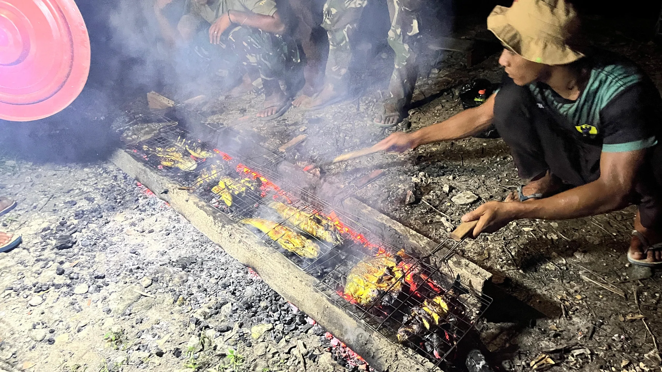 Di sela padatnya kegiatan pembangunan sasaran fisik, anggota Satgas TMMD memanfaatkan waktu istirahat dengan sederhana namun penuh makna: berkumpul dan makan bersama warga. Suasana hangat di sekitar bara api menjadi simbol kuatnya kemanunggalan TNI dan rakyat.
