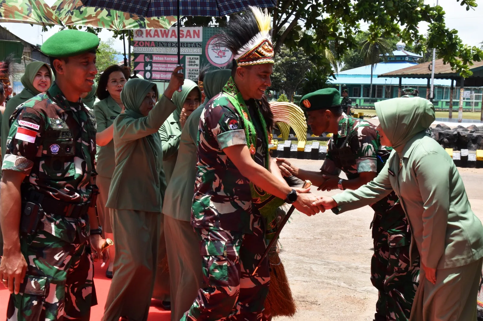 Kedatangan Pangdam disambut penuh semangat oleh Dandim 1707/Merauke Letkol Czi Dili Eko Setyawan, S.Ak., M.Han., beserta Ketua Persit KCK Cabang XVI Kodim 1707/Merauke Ny. Asti Dili Eko Setyawan. Suasana kian meriah saat tarian adat Papua Selatan mengiringi penyambutan, menandai hangatnya kehadiran pucuk pimpinan Kodam XXIV/Mandala Trikora. Ratusan Prajurit, PNS, dan Persit Kodim 1707/Merauke turut menyambut dengan antusias.