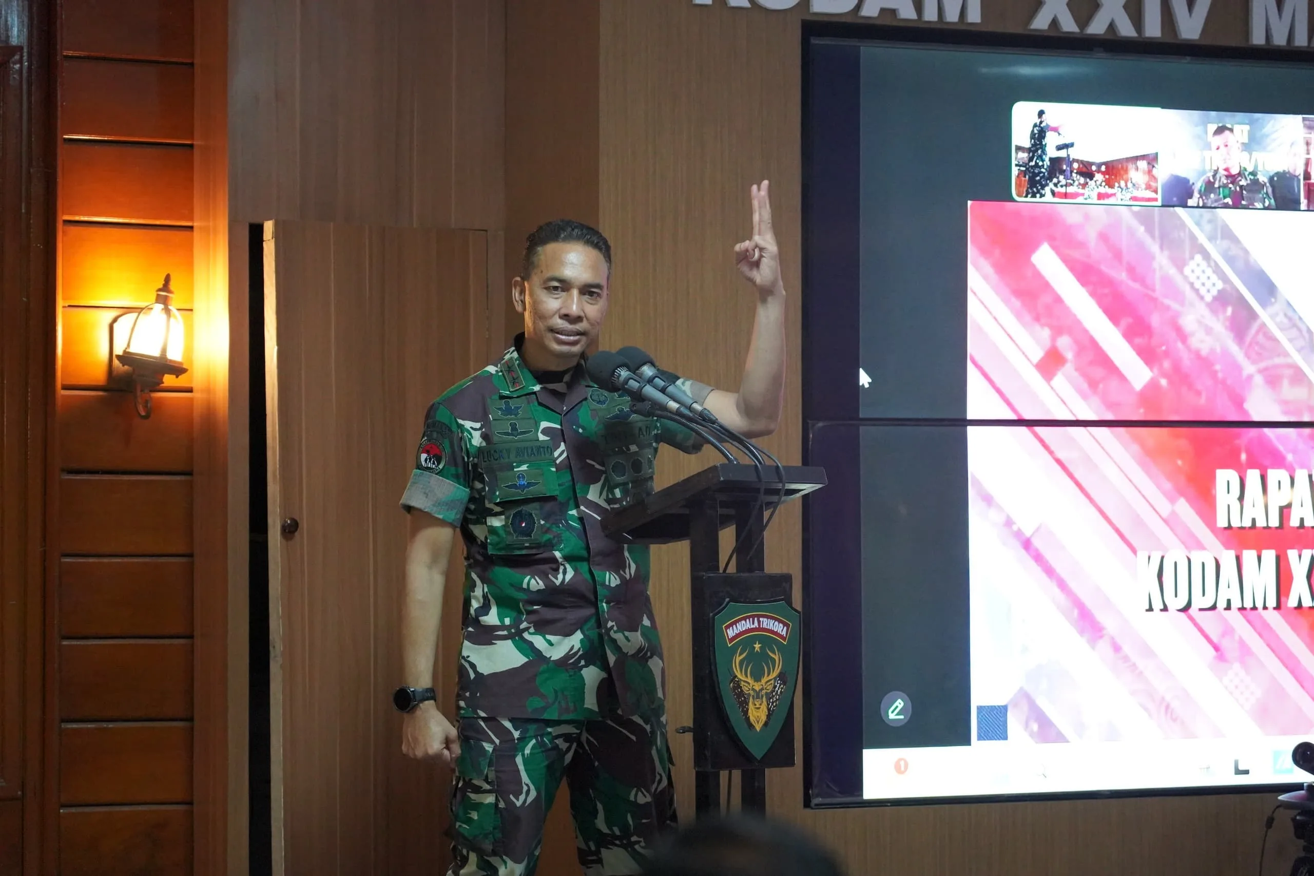 Merauke — Kodam XXIV/Mandala Trikora menggelar Rapat Evaluasi Program Kerja dan Anggaran Tahun Anggaran 2025 yang dipimpin langsung oleh Pangdam XXIV/Mandala Trikora Mayjen TNI Lucky Avianto, S.I.P., M.Si. Kegiatan yang berlangsung di Ruang Rekreasi Trikora ini juga di ikuti secara vicon serta dihadiri Kasdam, Irdam, Kapoksahli Pangdam, Danrem, para Pejabat Utama Kodam, Kabalak, serta Komandan Satuan jajaran Kodam XXIV/Mandala Trikora, Rabu (24/12/2025).