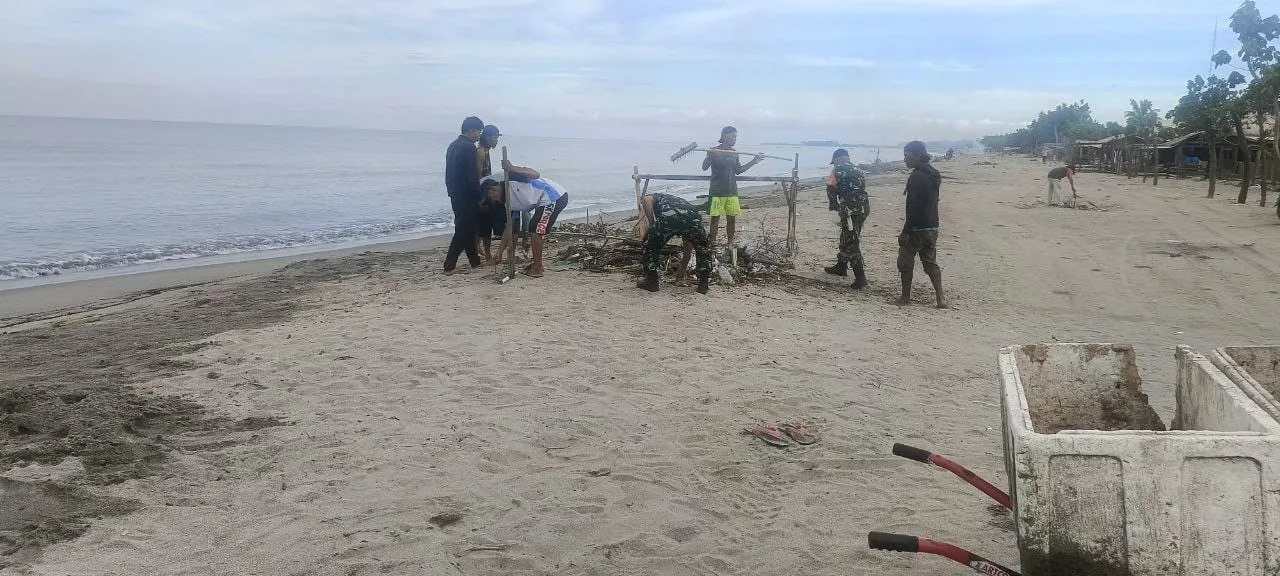 Pinrang_ Sebagai wujud kepedulian terhadap kebersihan lingkungan, Babinsa Koramil 1404-02/Mattiro Sompe Kodim 1404/Pinrang, Sertu Satirman, bersama warga setempat melaksanakan kegiatan kerja bakti pembersihan pesisir pantai di Lingkungan Langnga, Kelurahan Langga, Kecamatan Mattiro Sompe, Kabupaten Pinrang, Selasa (27/01/2026).