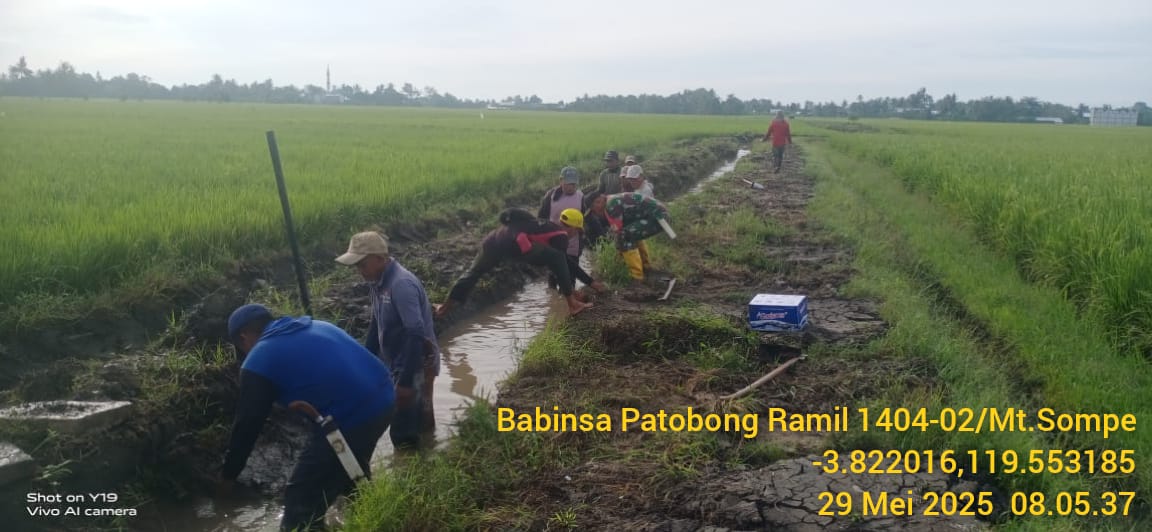 Pinrang_ Agar air lancar mengairi persawahan, Babinsa Koramil-02/Mattiro Sompe Kodim 1404/Pinrang Serka Mustaming bersama warga melaksanakan kerja bakti pembersihan saluran irigasi di persawahan Dusun Tanete Desa Patobong Kecamatan Mattiro Sompe Kabupaten Pinrang, Jum’at (30/05/2025).
