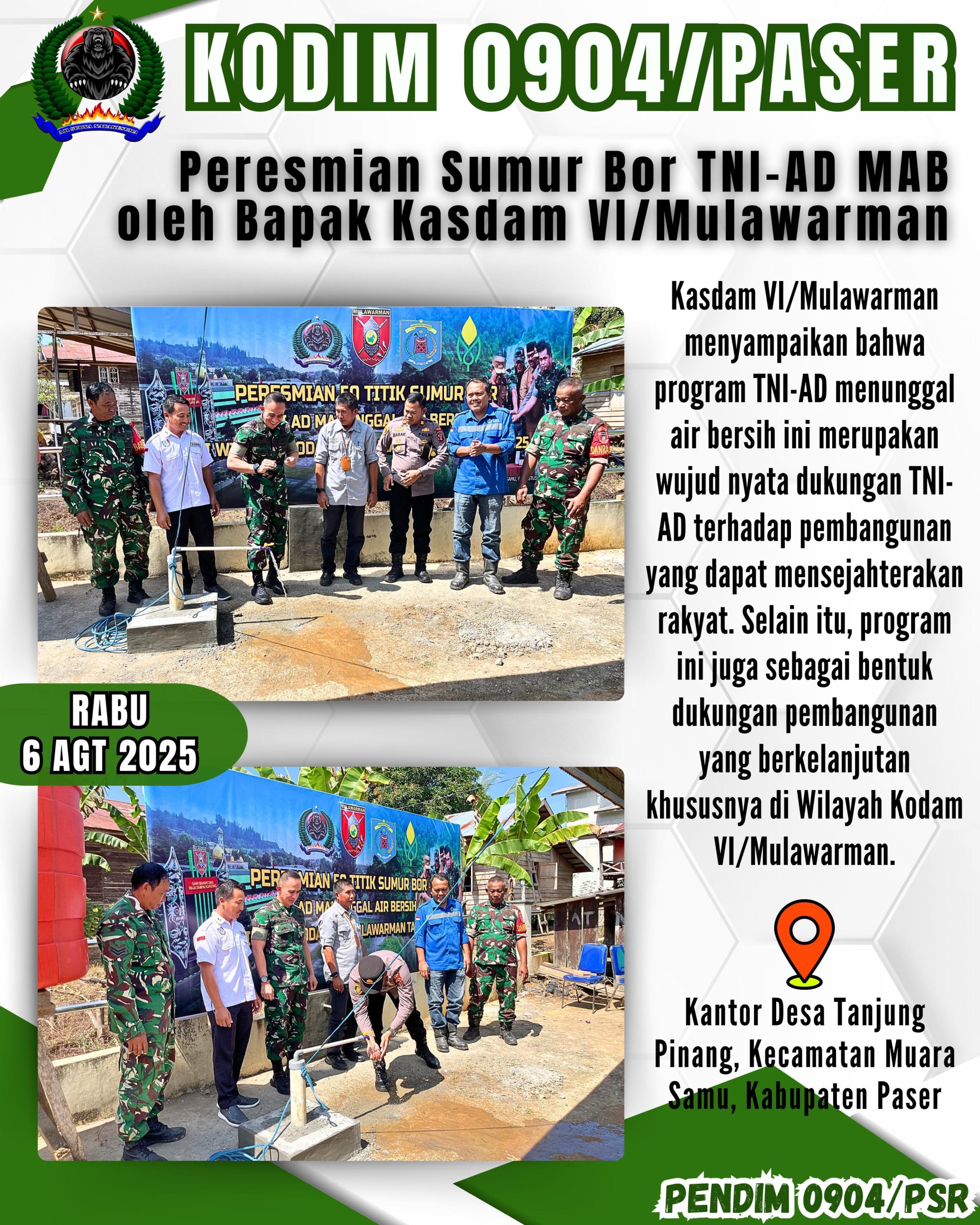 Kodim 0904/Psr, Korem 091/ASN, Kodam VI/Mlw – Pada hari Rabu tanggal 6 Agustus 2025 pukul 09.30 Wita, bertempat di Kantor Desa Tanjung Pinang, Kecamatan Muara Samu, Kabupaten Paser telah dilaksanakan Kegiatan Vicon Peresmian 50 Titik Sumur Bor TNI-AD Manunggal air Bersih Wilayah Kodam VI/Mulawarman, Rabu (6/8/2025).
