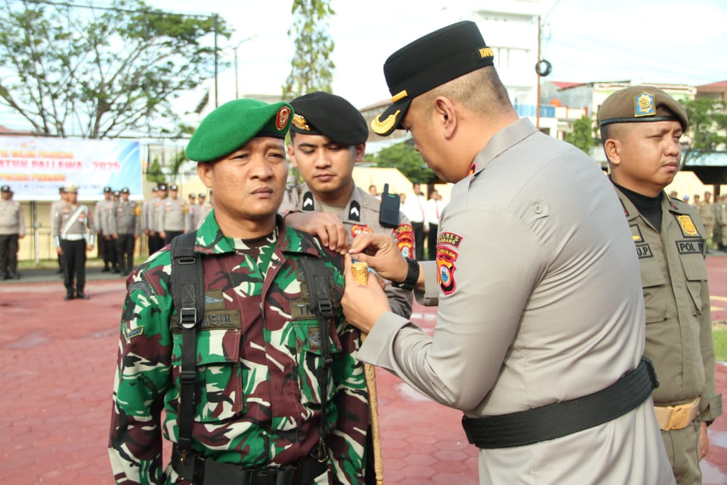 Pinrang_ Personel Kodim 1404/Pinrang mengikuti apel gelar pasukan Operasi Patuh Pallawa tahun 2025 dengan tema “Tertib berlalu-lintas demi terwujudnya Indonesia emas”, bertempat di lapangan apel Polres Pinrang, Senin (14/07/2025).