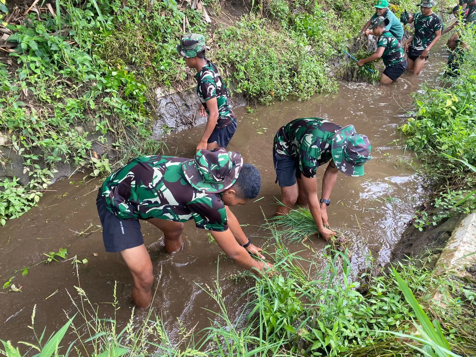 Sejak pagi, prajurit dan warga bergotong-royong menyisir sepanjang bantaran sungai untuk mengangkat sampah, ranting, serta gulma yang menghambat aliran air.
