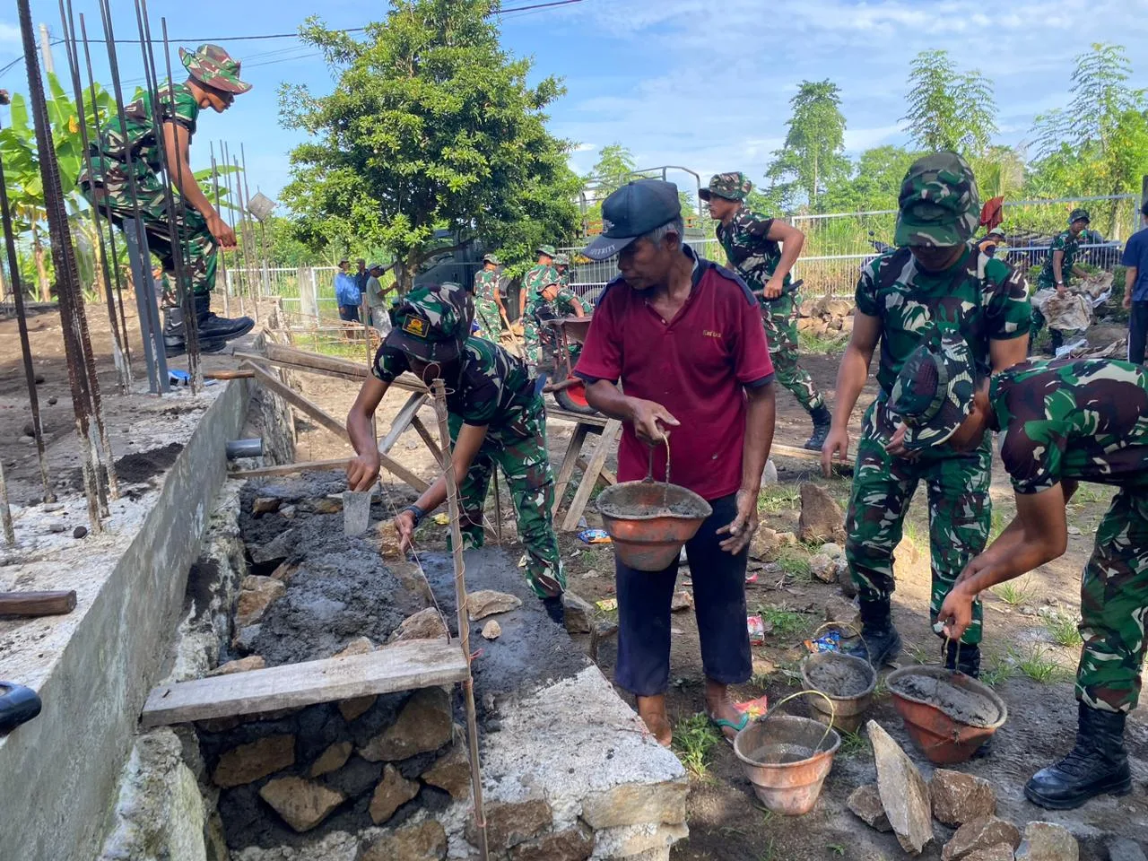 Sejak pagi, prajurit bersama masyarakat bahu-membahu mengangkut material, melakukan pengecoran, pemasangan batu, serta pembersihan area sekitar masjid.