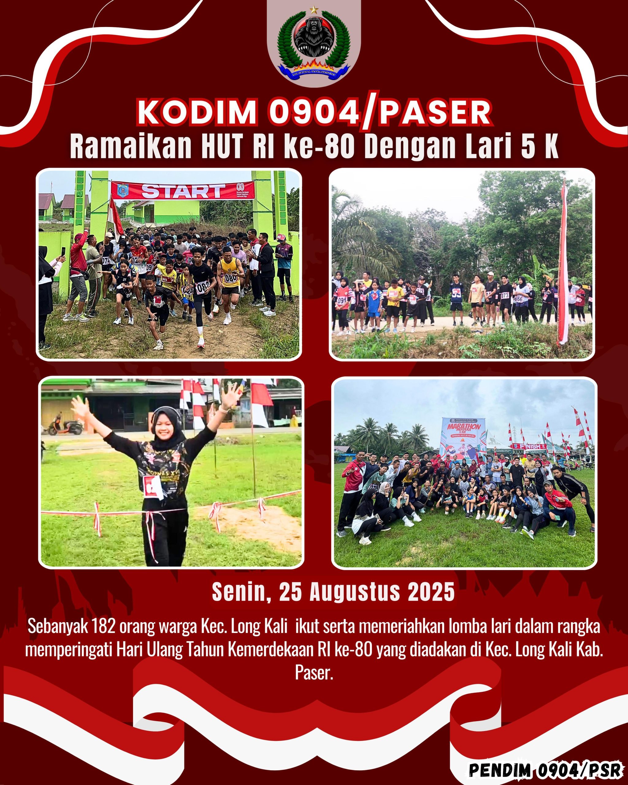 Kodim 0904/Psr, Korem 091/ASN, Kodam VI/Mlw – Sebanyak 182 orang warga Kec. Long Kali ikut serta memeriahkan lomba lari dalam rangka memperingati Hari Ulang Tahun Kemerdekaan RI ke-80 yang diadakan di Kec. Long Kali Kab. Paser, Senin (25/9/2025)