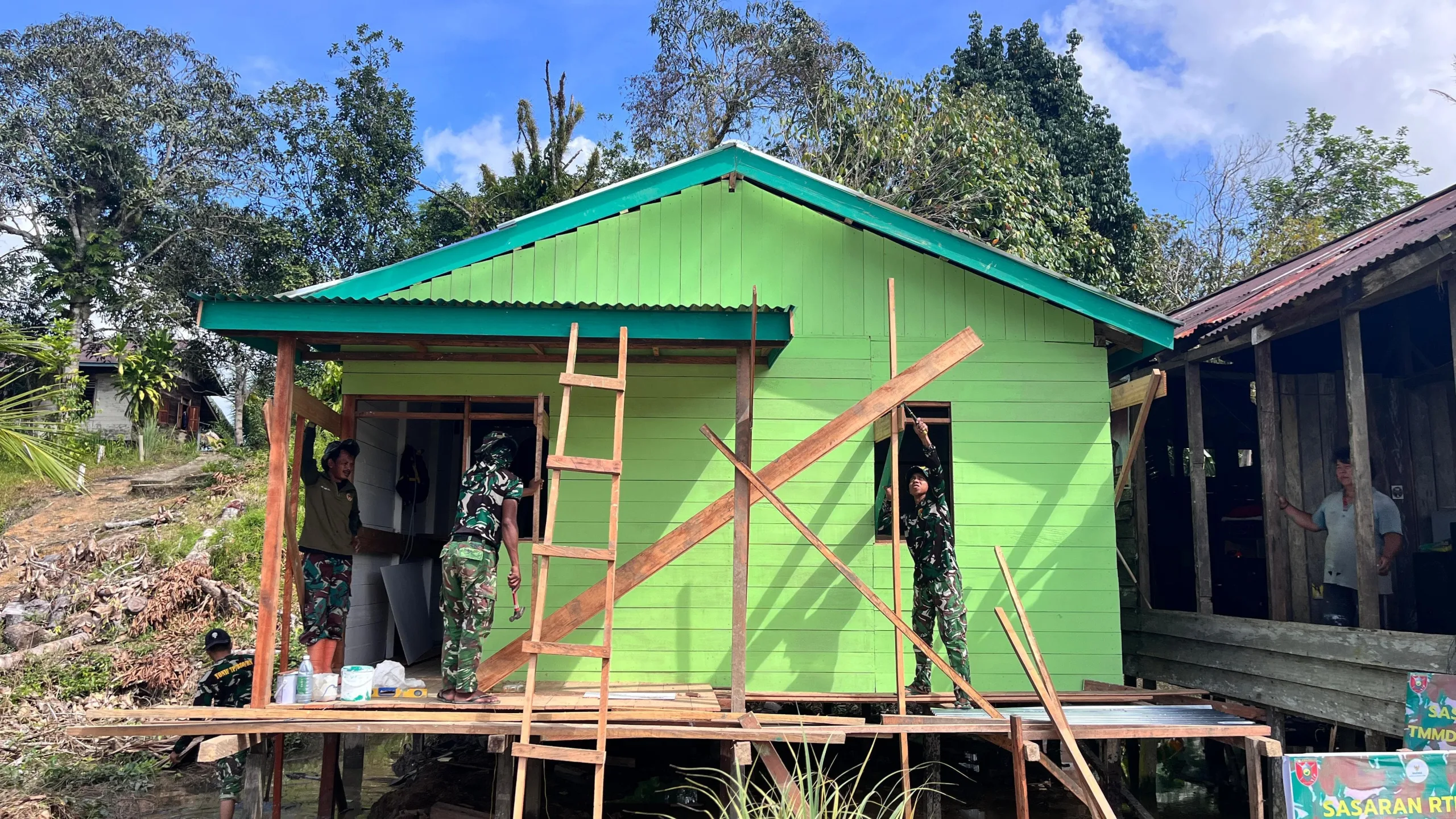 Bulungan – Pengerjaan rumah milik Bapak Binjamin di RT 16 Betiang, Desa Salimbatu, Kecamatan Tanjung Palas Tengah, Kabupaten Bulungan yang menjadi salah satu sasaran program TMMD ke-127 Kodim 0903/Bulungan kini telah memasuki tahap finishing. Anggota Satgas TMMD bersama warga terus bekerja keras untuk mempercepat penyelesaian pembangunan rumah tersebut, Sabtu (07/03).