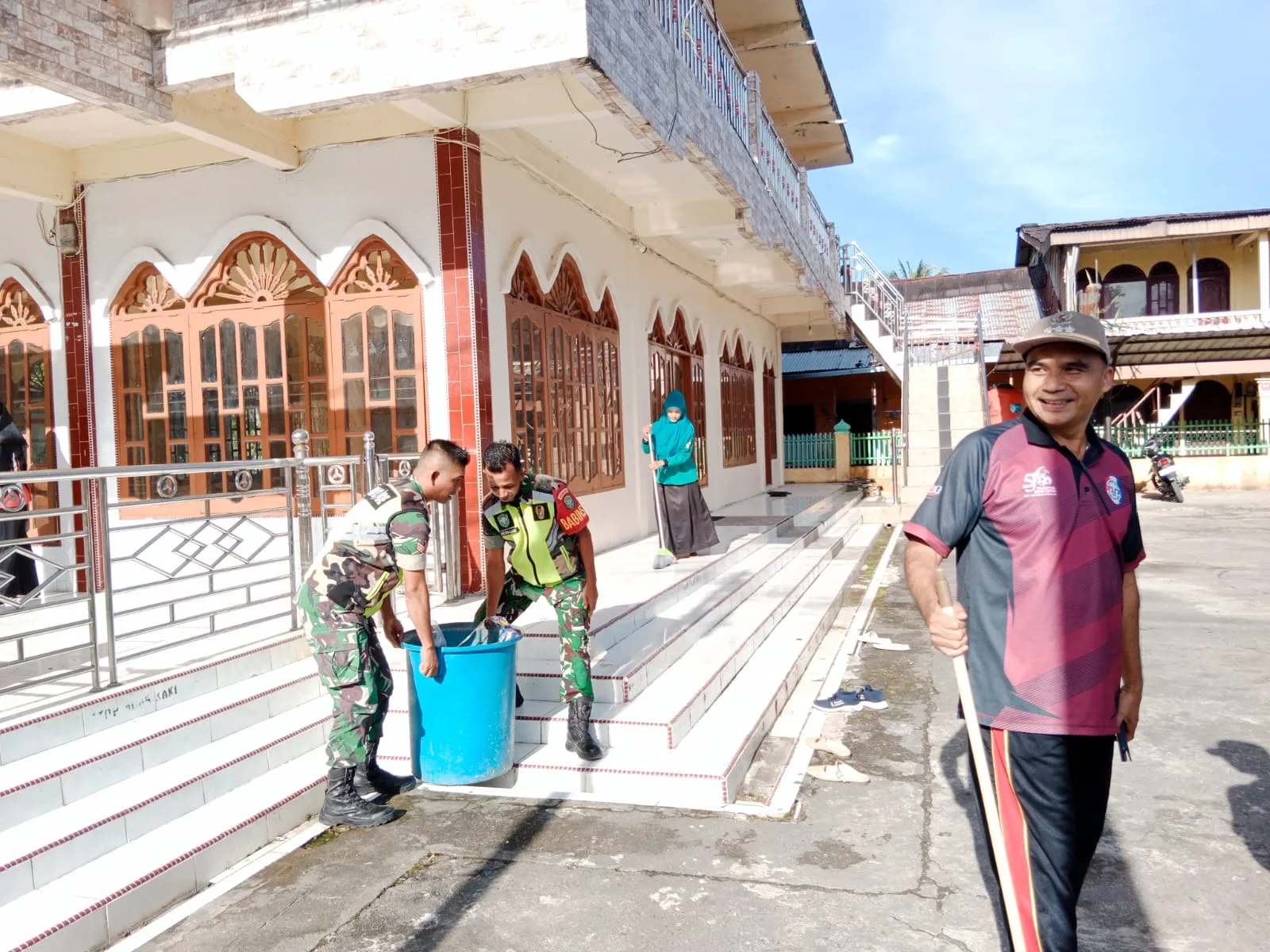 Kegiatan pembersihan difokuskan pada area dalam dan luar meunasah, mulai dari menyapu, mengepel lantai, merapikan halaman, hingga membersihkan tempat wudhu. Suasana kebersamaan terlihat saat aparat dan pegawai kecamatan bekerja berdampingan demi menciptakan lingkungan ibadah yang bersih dan nyaman bagi masyarakat.