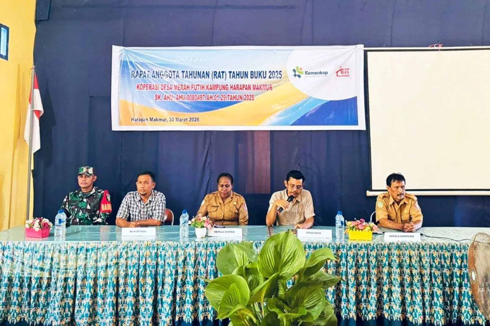Babinsa Kampung Harapan Makmur Pos Ramil Kurik Koramil 1707-02/Merauke Kodim 1707/Merauke Serda Vincensius Dasi menghadiri kegiatan Rapat Anggota Tahunan (RAT) Tahun Buku 2025 Koperasi Desa Merah Putih Kampung Harapan Makmur. Kehadiran Babinsa ini menjadi wujud nyata kepedulian TNI terhadap pembangunan ekonomi masyarakat di tingkat kampung. Kegiatan yang berlangsung pada Sabtu, 4 April 2026 pukul 09.00 WIT di Balai Kampung Harapan Makmur, Distrik Kurik, Kabupaten Merauke – Provinsi Papua Selatan tersebut berjalan tertib dan penuh semangat kebersamaan.