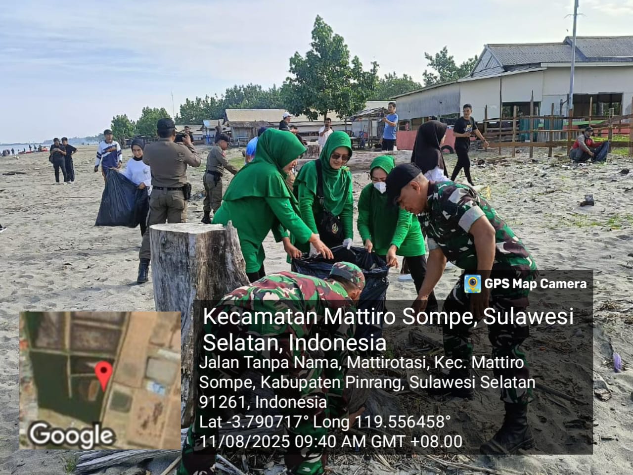 Pinrang_ Sinergitas 3 pilar yakni Babinsa Jajaran Koramil-02/Mattiro Sompe Kodim 1404/Pinrang, Bhabinkamtibmas jajaran Polsek Mattiro Sompe, Staf Kecamatan dan Desa serta masyarakat melaksanakan kegiatan pelestarian alam dengan melakukan pembersihan pantai wisata Ammani di Desa Mattiro Tasi Kecamatan Mattiro Sompe Kabupaten Pinrang, Senin (11/08/2025).