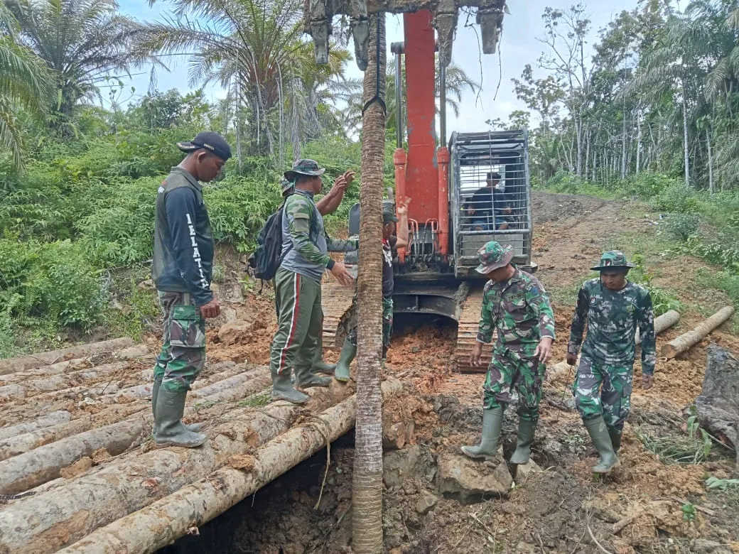 Simeulue – Personil Satgas TMMD Kodim 0115/Simeulue, Korem 012/Teuku Umar melaksanakan pembuatan jembatan kayu di Desa Ana’o, Kecamatan Teupah Selatan, Kabupaten Simeulue. Senin (13/10/2025).