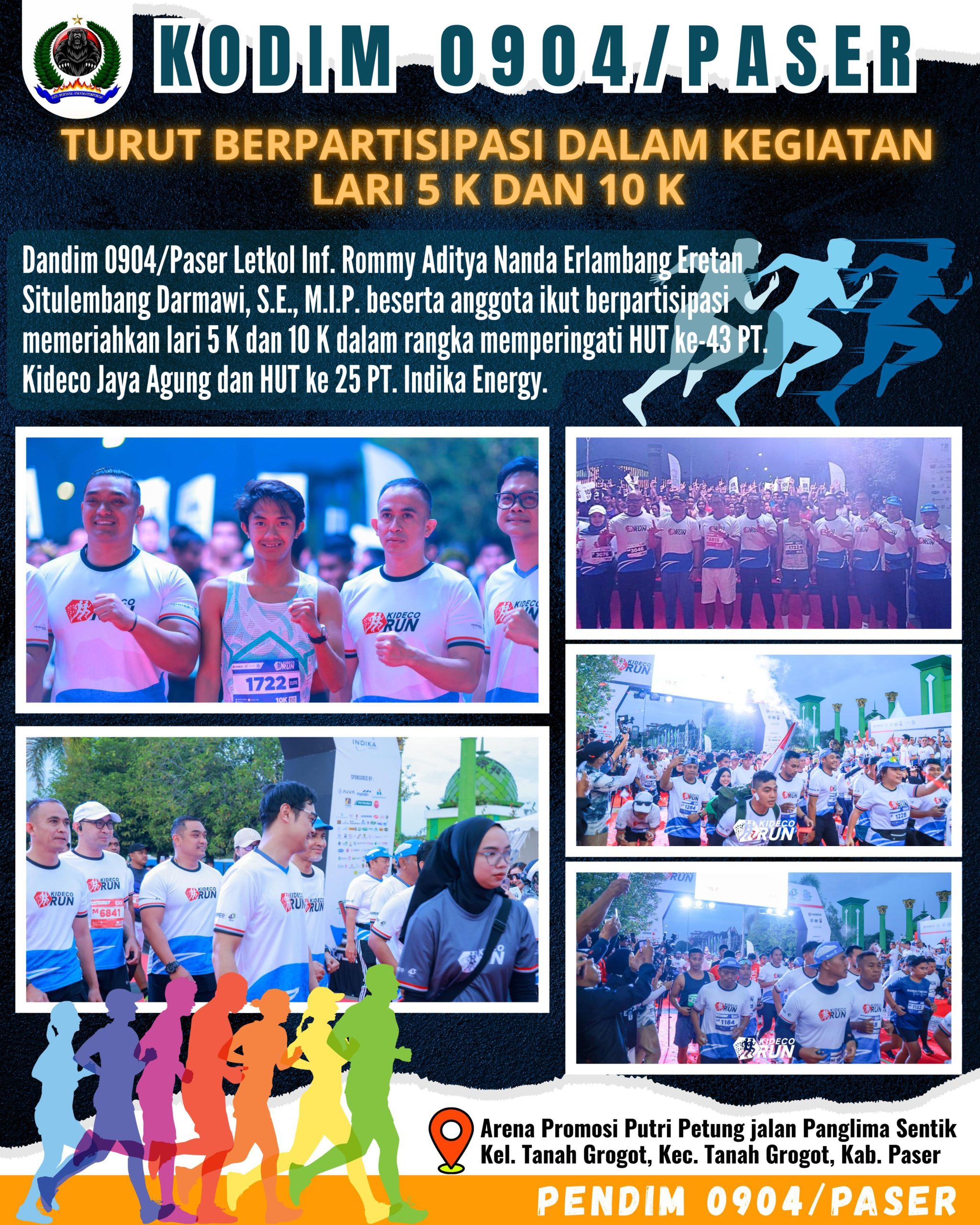 Kodim 0904/Paser, Korem 091/ASN, Kodam VI/Mlw – Dalam rangka memperingati HUT ke-43 PT. Kideco Jaya Agung dan HUT ke 25 PT. Indika Energy, Dandim 0904/Paser Letkol Inf. Rommy Aditya Nanda Erlambang Eretan Situlembang Darmawi, S.E., M.I.P. beserta anggota ikut berpartisipasi memeriahkan lari 5 K dan 10 K di Arena Promosi Putri Petung jalan Panglima Sentik Kel. Tanah Grogot, Kec. Tanah Grogot, Kab. Paser, (31/8/2025)