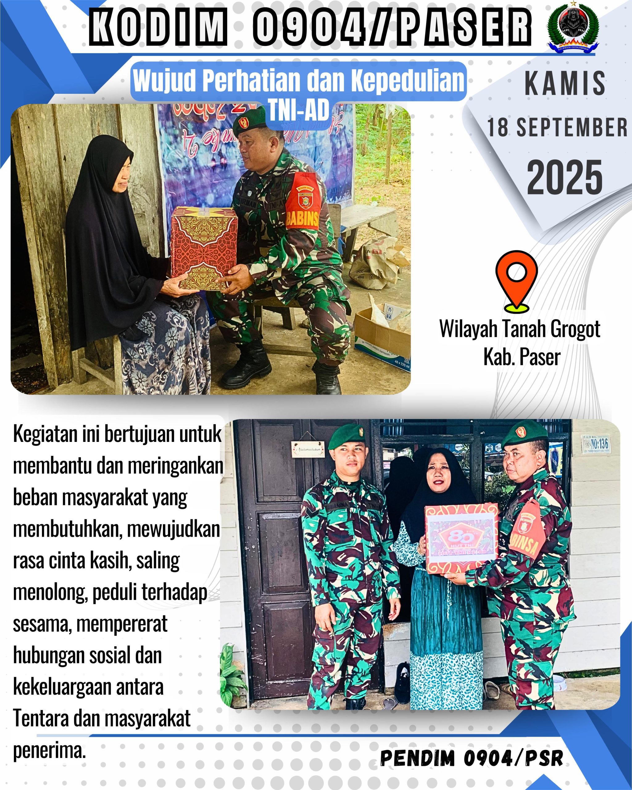 Kodim 0904/Psr, Korem 091/ASN, Kodam VI/Mlw – Dalam rangka memperingati Hari Ulang Tahun TNI Angkatan Darat ke-80, Kodim 0904/Psr menggelar bakti sosial pembagian paket sembako di wilayah Kec. Tanah Grogot, Kab Paser, Rabu (18/9/2025).